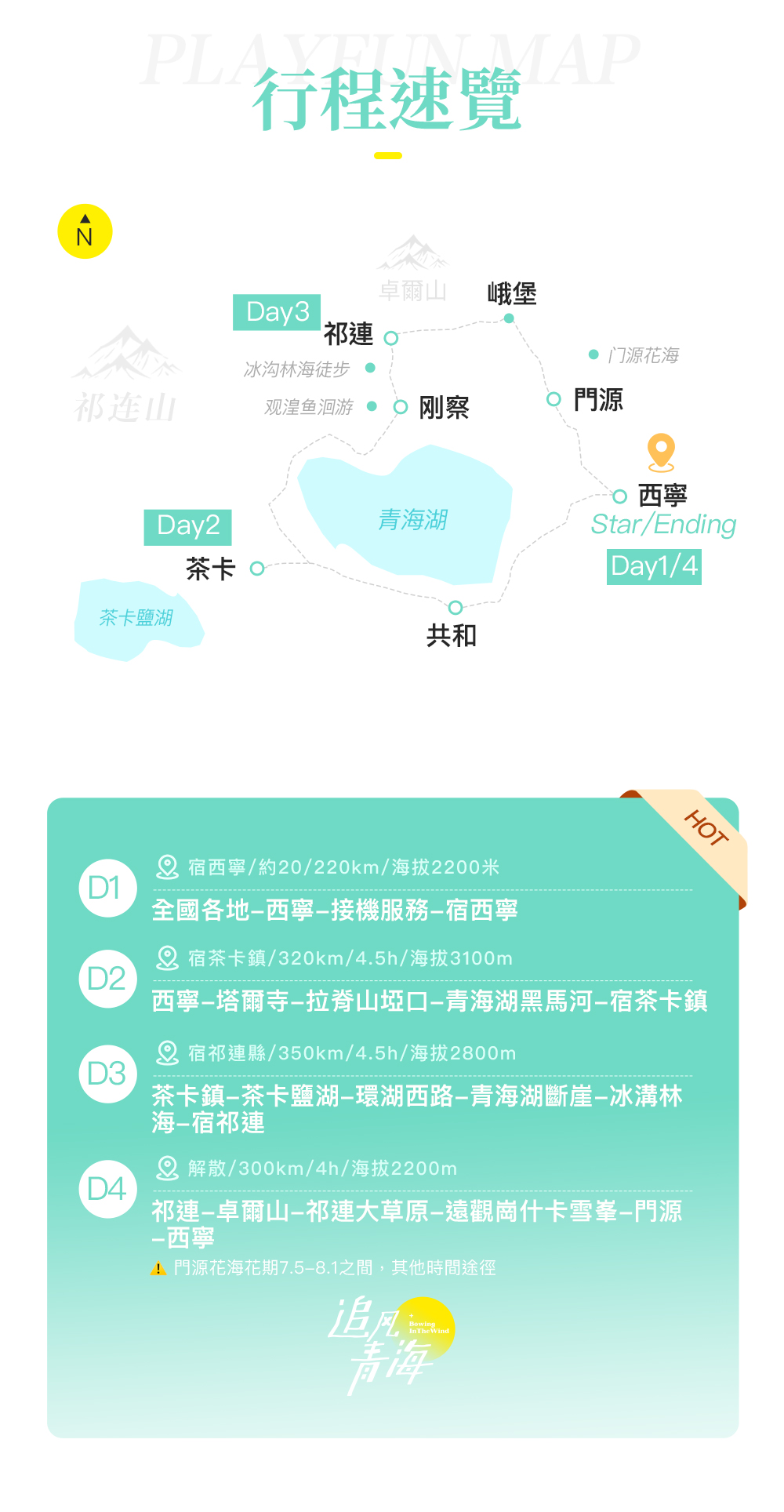 - D4:祁連-卓爾山-祁連草原-崗什卡雪峰(遠觀)-門源-西寧市區散團【距離280km 車程約3.5h 】