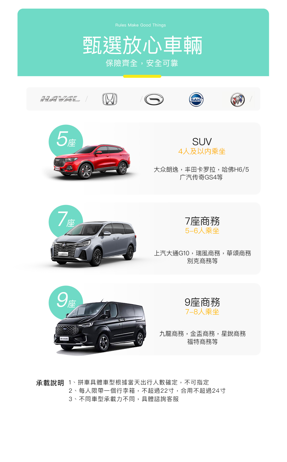 - 【小團出行】根據人數安排9座/7座商務車型/5座車型。