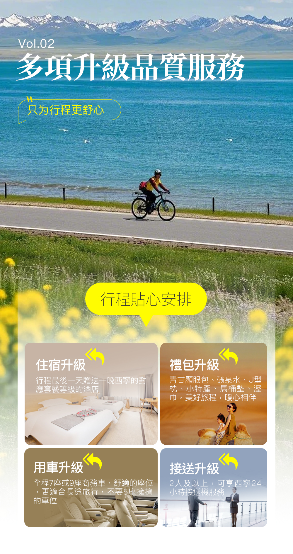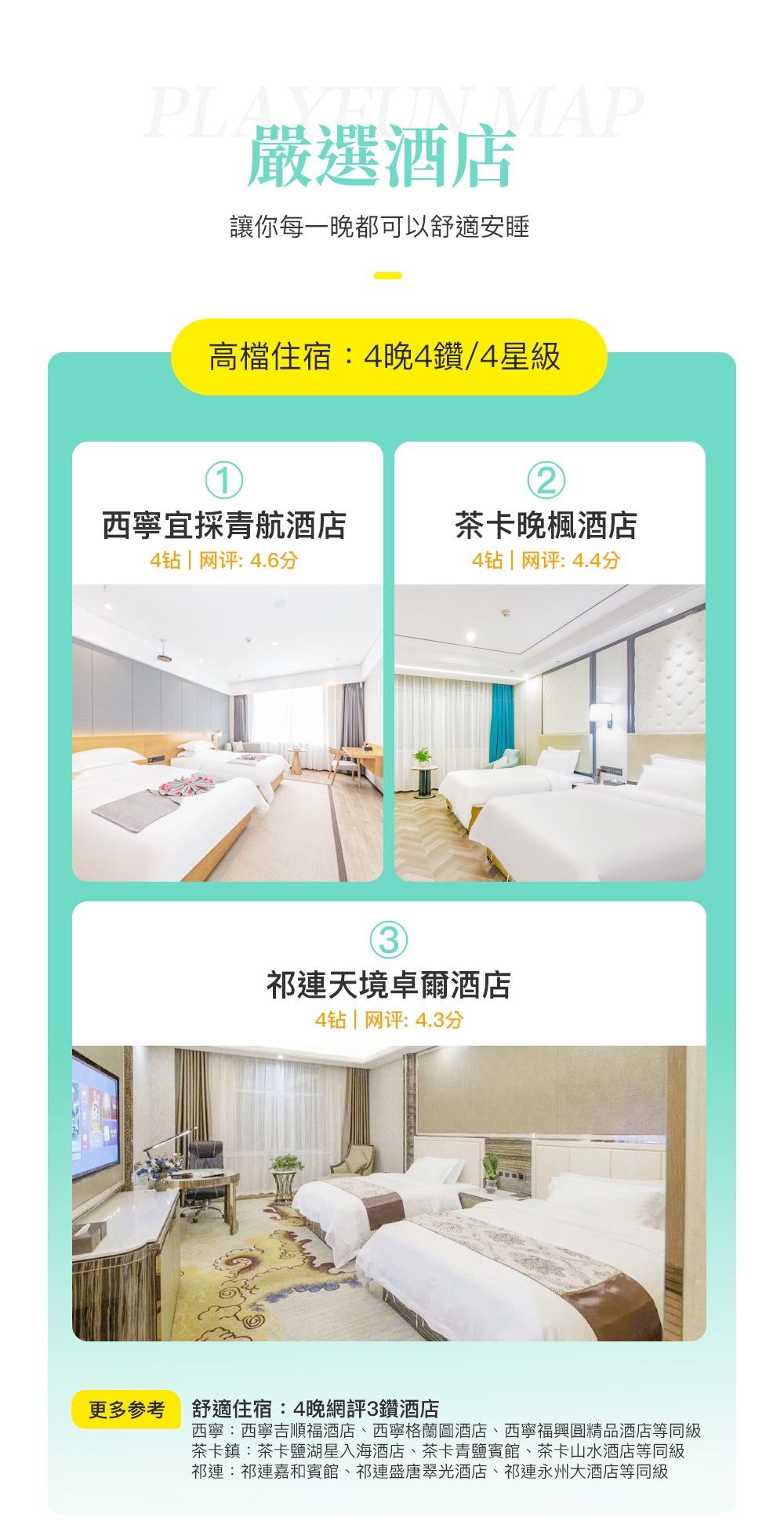 - 由於青甘沿線部分地區對港澳臺客人的接待有特定要求,需安排具備接待資質的高星級酒店。為確保順利入住,請港澳臺客人預訂輕奢套餐(4鑽級酒店)。
