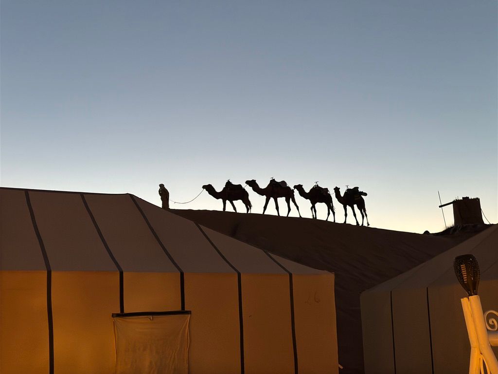 在梅爾祖卡中心的豪華帳篷中度過一晚,在沙漠中心享用柏柏爾晚餐和音樂,並在日落時分騎駱駝。