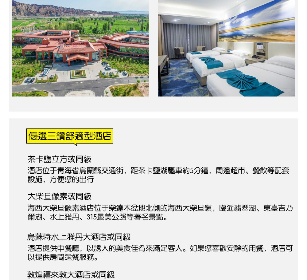 B線西北風情飯店:2晚敦煌山莊+2晚大柴旦+甄選4鑽飯店