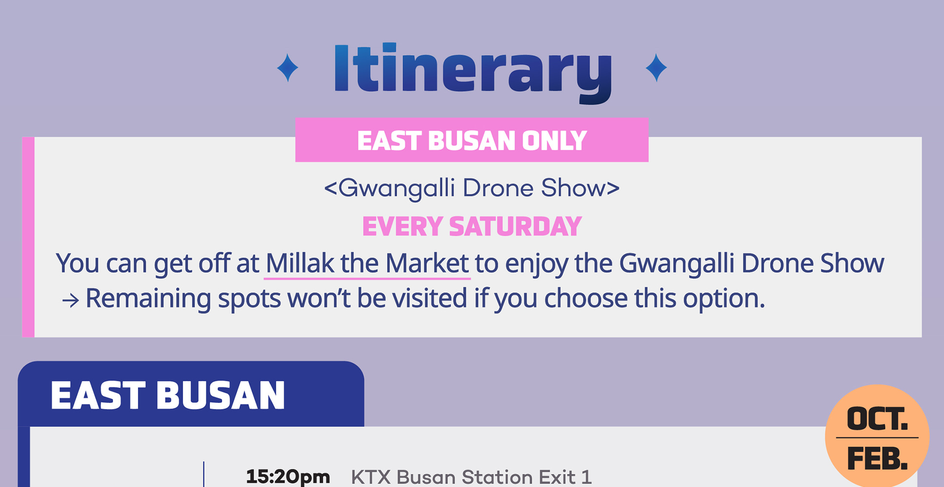 【僅限釜山東部遊】每週六:您可以在Millak The Market結束行程,觀看廣安裡無人機燈光秀。如果您選擇此選項,則不會參觀剩餘景點。