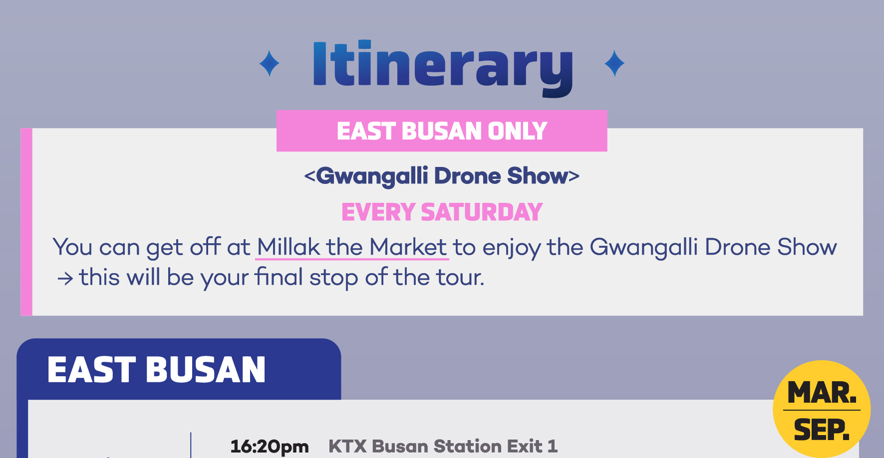 【僅限釜山東部遊】每週六:您可以在民樂洞生魚片街下車,欣賞廣安裡無人機燈光秀——這將是本次行程的最後一站。