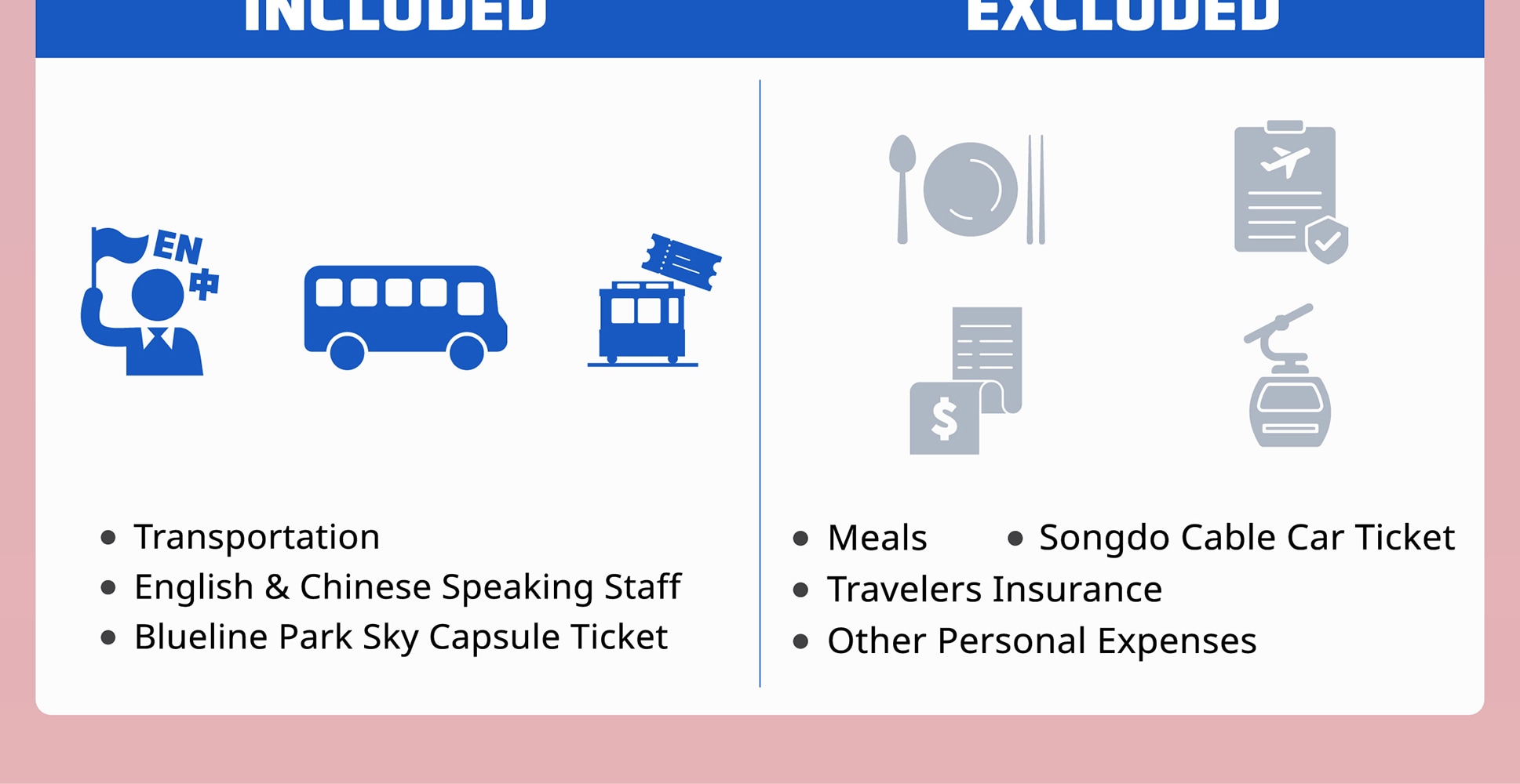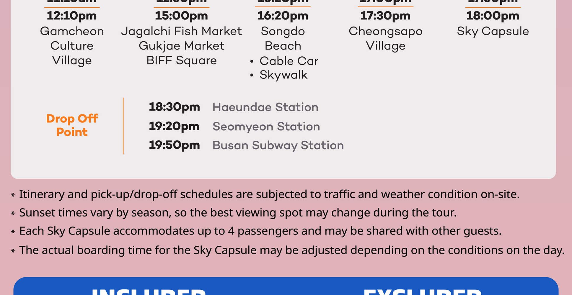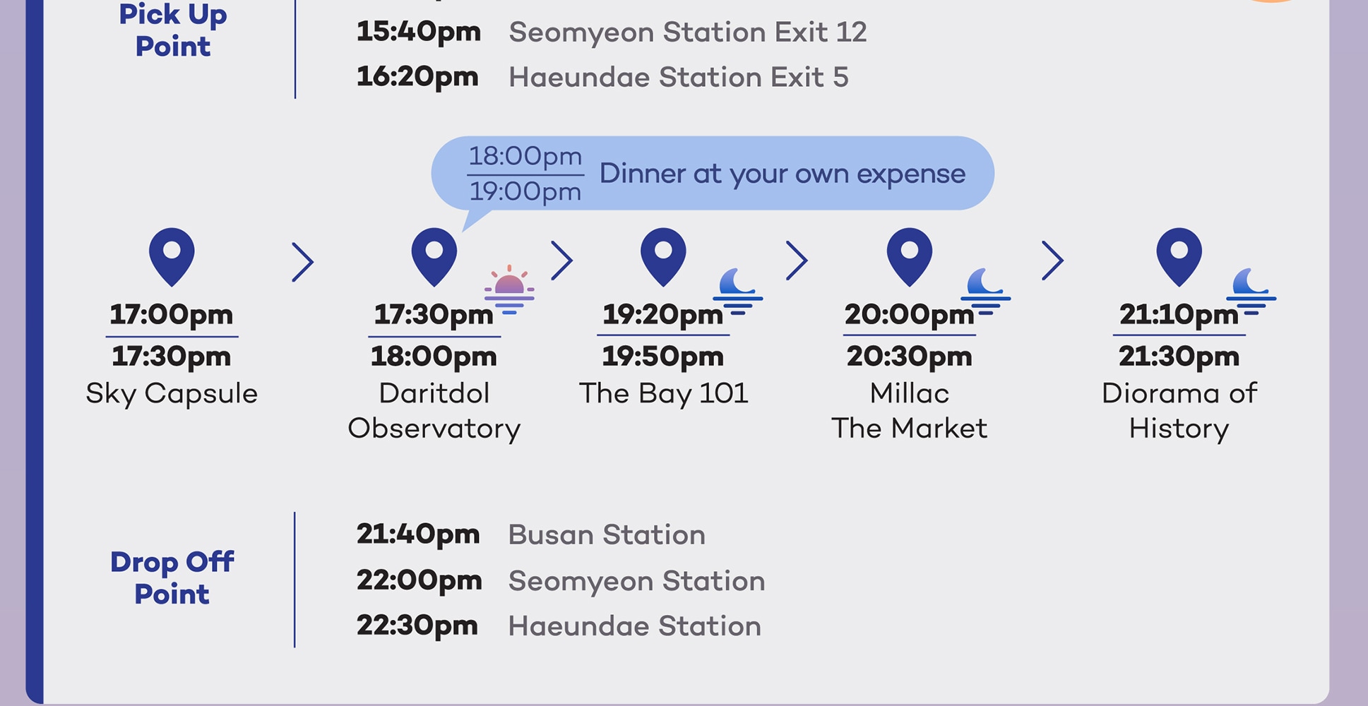 Q5) 可以攜帶行李箱嗎? - 關於攜帶行李,請聯繫我們的客服團隊,因為這取決於您旅行當天巴士的大小。我們建議您在旅行前一天韓國時間上午10點之後聯繫我們。