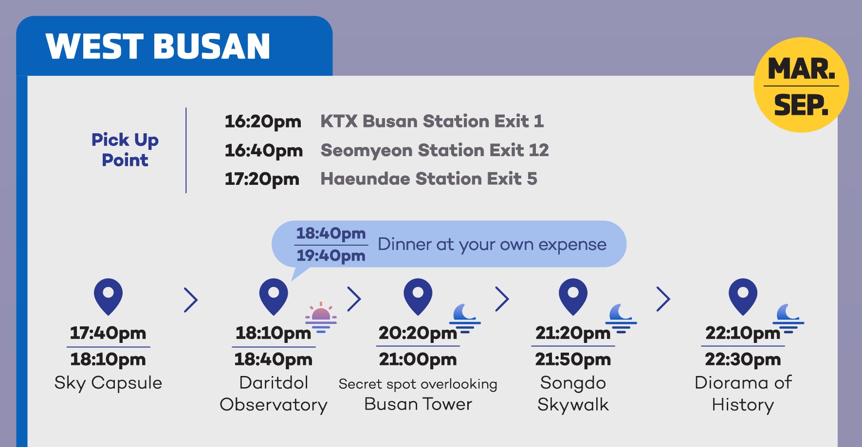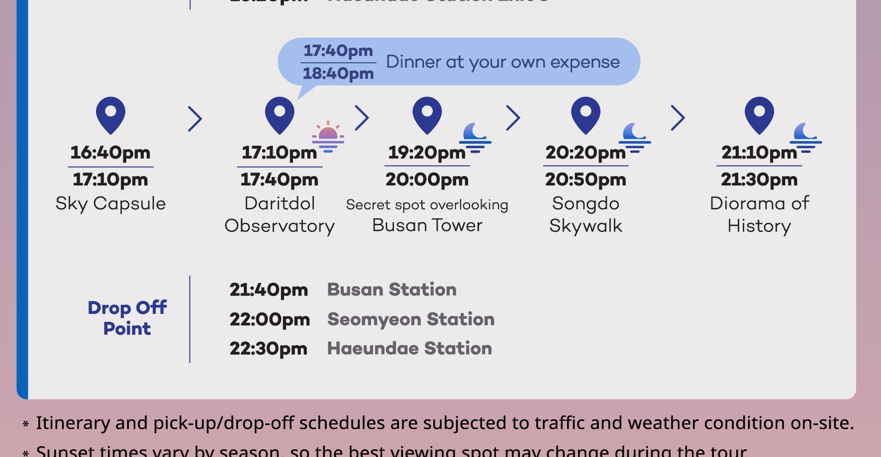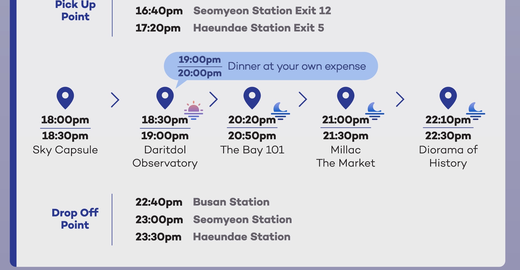 當太陽落山,城市燈火通明時,體驗釜山的神奇魅力——加入我們的行程,探索鎮上最佳的日落和夜景地點!