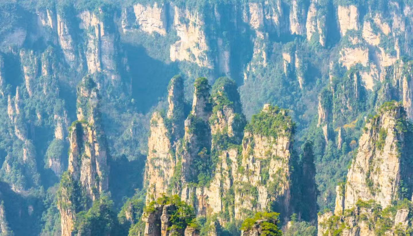 張家界國家森林公園,無疑是這片土地上的瑰寶。園內森林覆蓋率超 95%,空氣澄澈,富含負氧離子,是天然氧吧。朝暉夕照穿雲,傾灑在連綿峰林間。石英砂岩峰林形態各異、拔地而起,與山間黃綠交織的樹木相映成趣,雄渾又不失秀麗,暖光勾勒出震撼迷人的氛圍