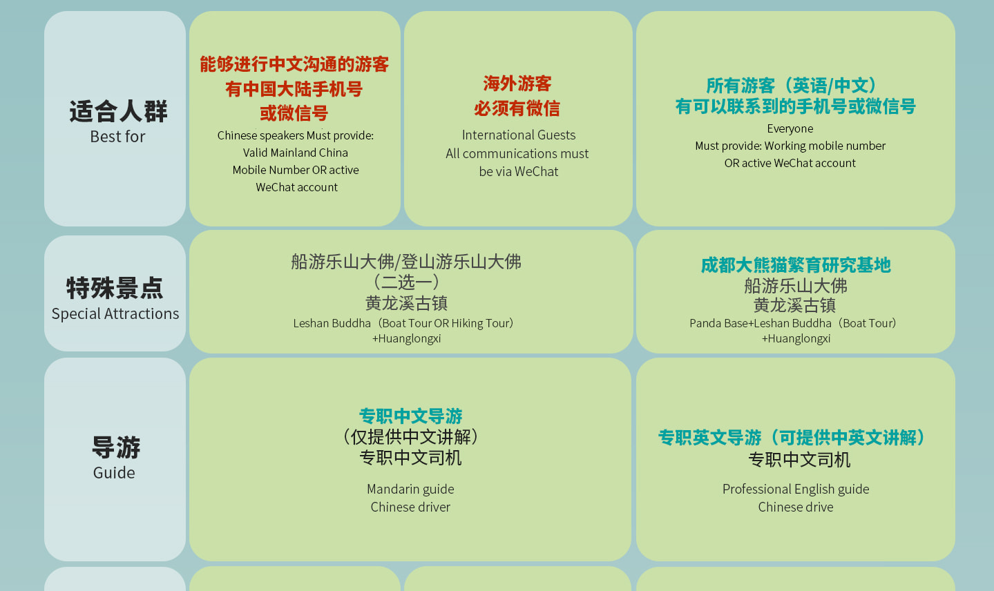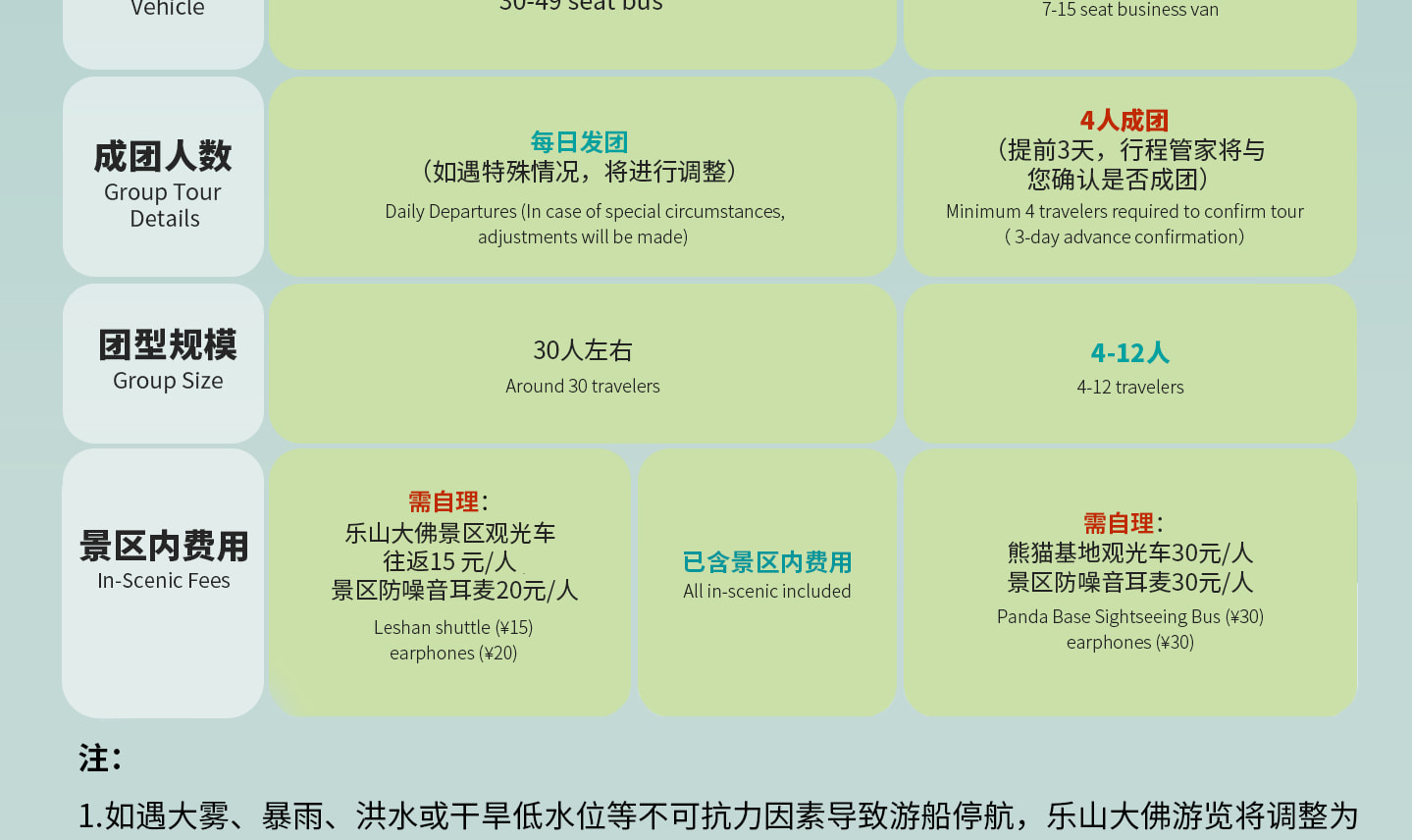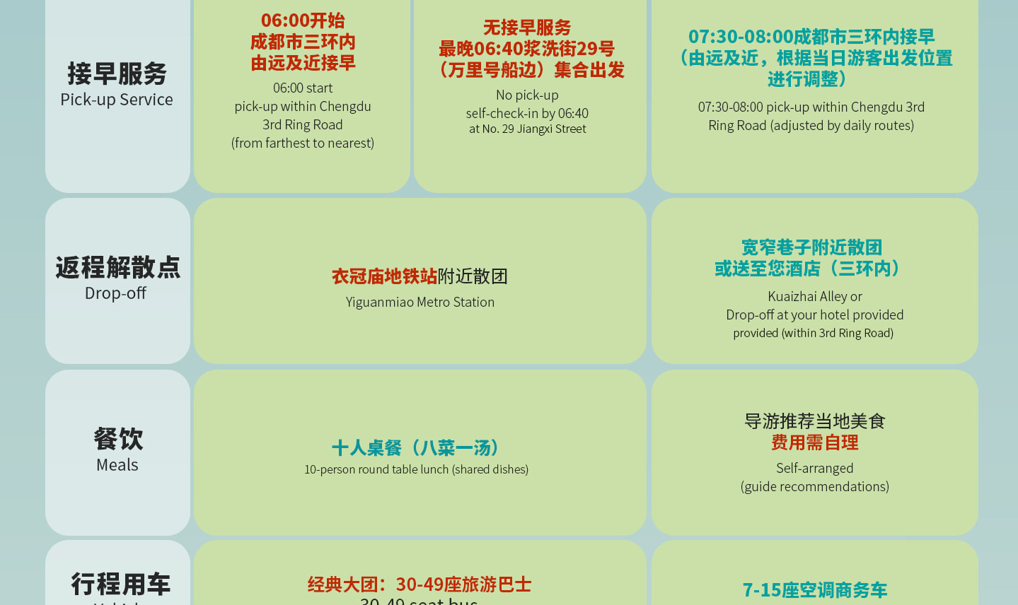 - 英文導遊精品團:07:30-08:00,我們將在成都三環路範圍內的飯店或民宿逐一接送。