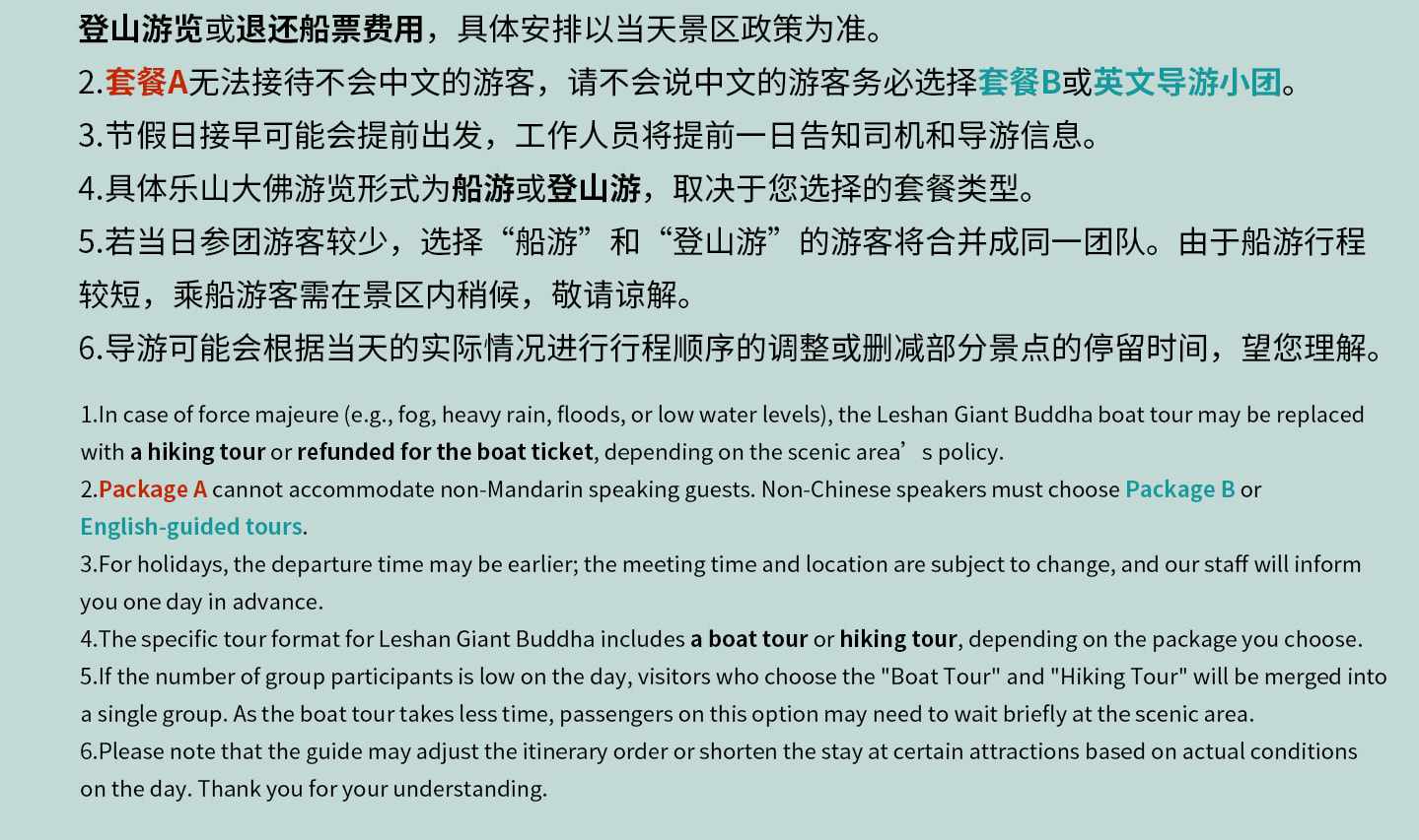 - 經典大團:06:40 漿洗街29號萬里號船邊集合,🚗 選擇含接早服務方案的客人,06:00開始,我們將在成都三環路範圍內的飯店或民宿逐一接送。