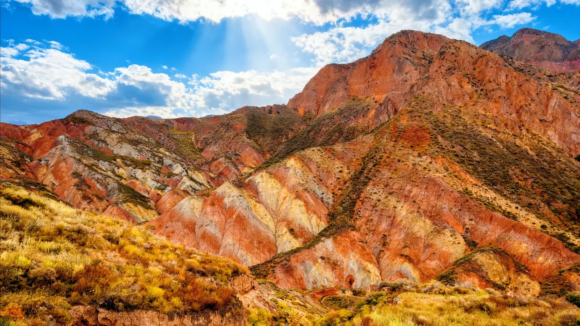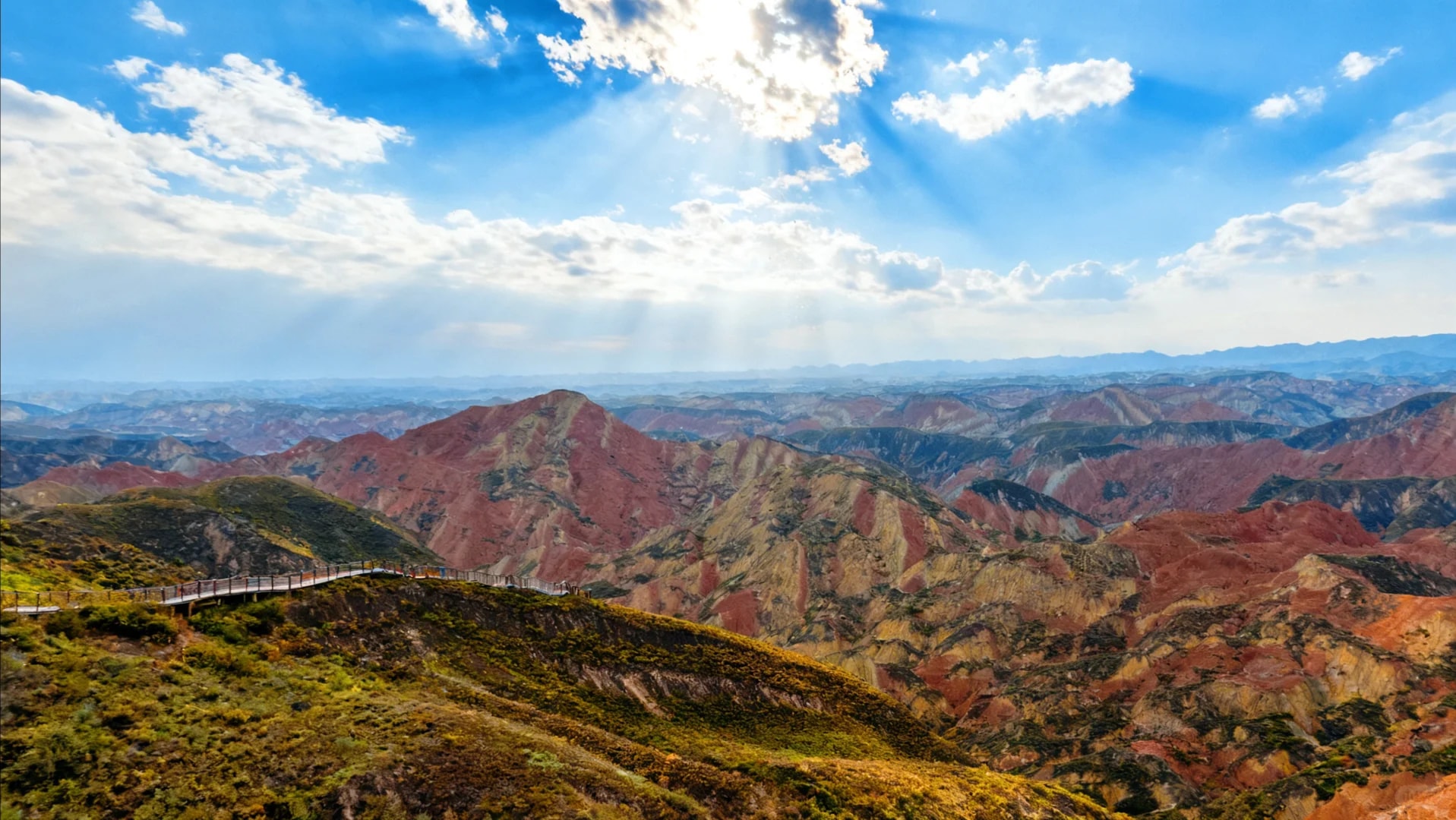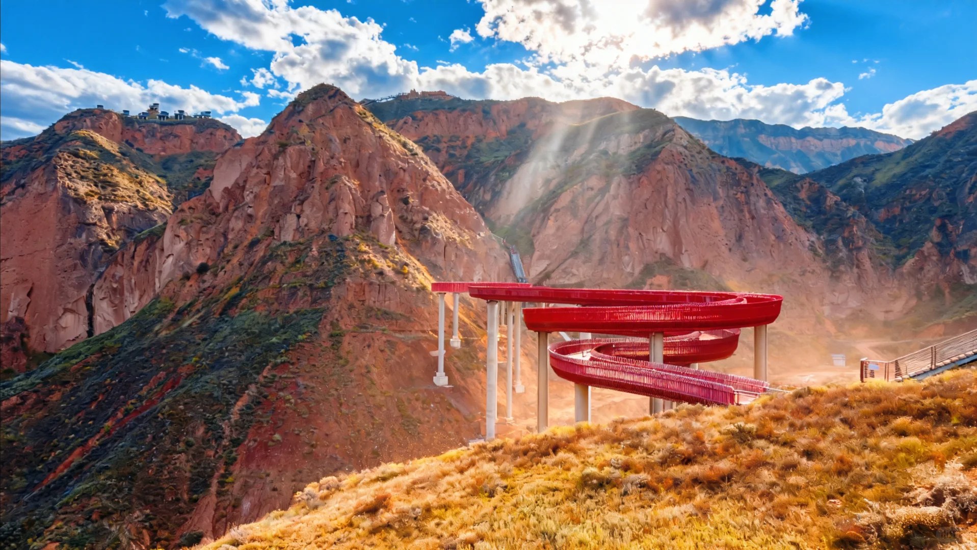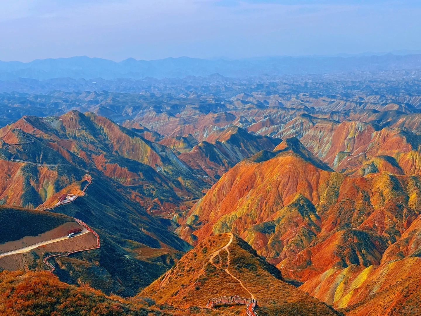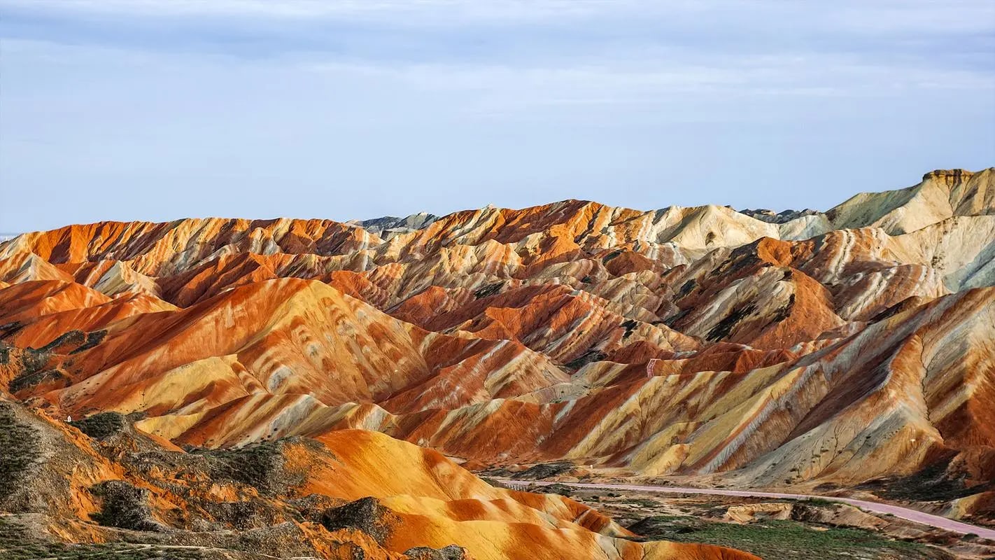 這是蘭州水墨丹霞,堪稱自然締造的視覺奇觀。連綿起伏的山巒被大自然以斑斕色彩精心暈染,橙、黃、赤、褐等色調如油畫般層層堆疊,在陽光下璀璨奪目。陡峭的巖壁佈滿褶皺與溝壑,記錄著歲月雕琢的痕跡。其規模之宏大、色彩之絢麗、造型之奇特世所罕見,不僅是地質研究的天然寶庫,更以磅礴氣勢成為攝影與旅行愛好者心馳神往的絕美聖地。