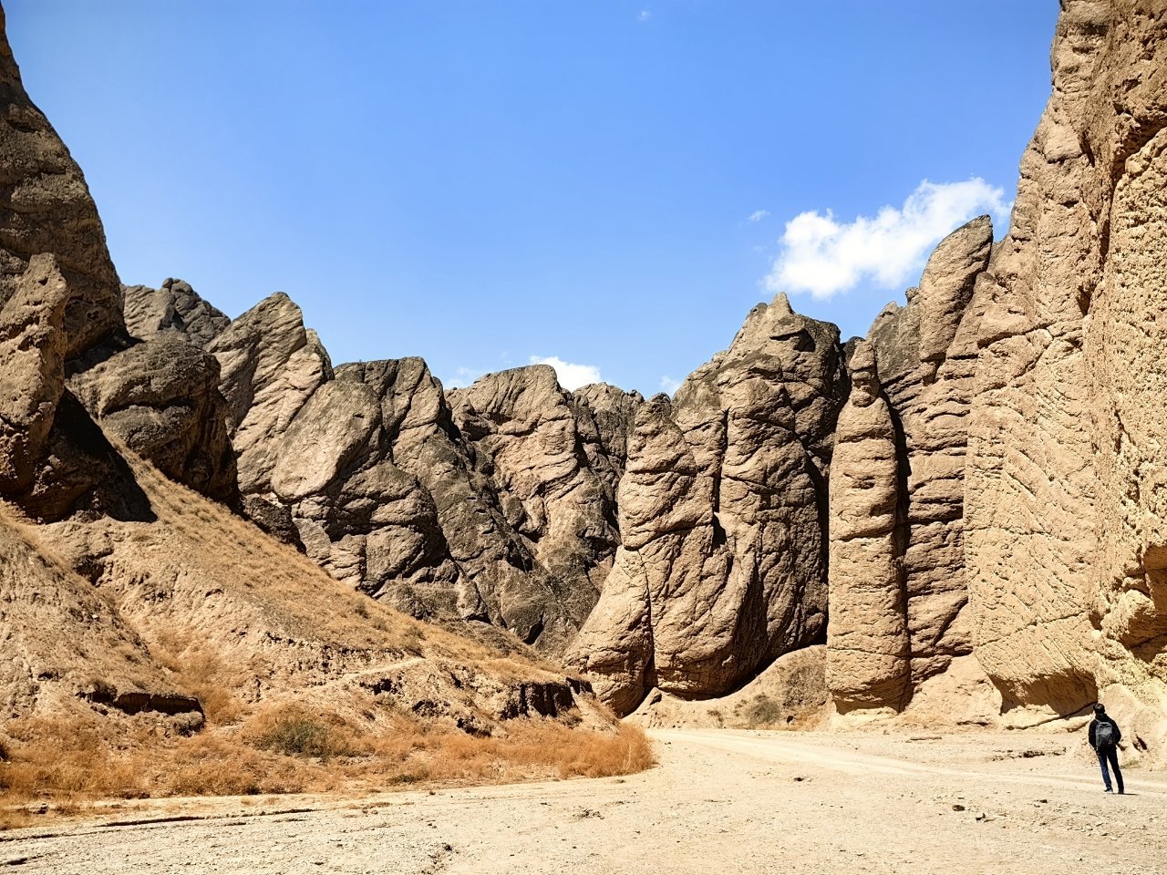 這是黃河石林景區。棕褐色的石林巍峨聳立,石柱如利劍直插雲霄,表面佈滿風蝕褶皺,紋理粗獷而蒼勁。陡峭巖壁形成狹長峽谷,地面覆蓋沙土與稀疏乾草,更顯荒涼質感。畫面右下角的人物渺小如蟻,反襯出石林規模的恢弘磅礴。湛藍天空僅綴一朵白雲,與暖色調石林形成鮮明碰撞,整體畫面充滿野性張力,盡顯西北地貌的壯美與寂寥。