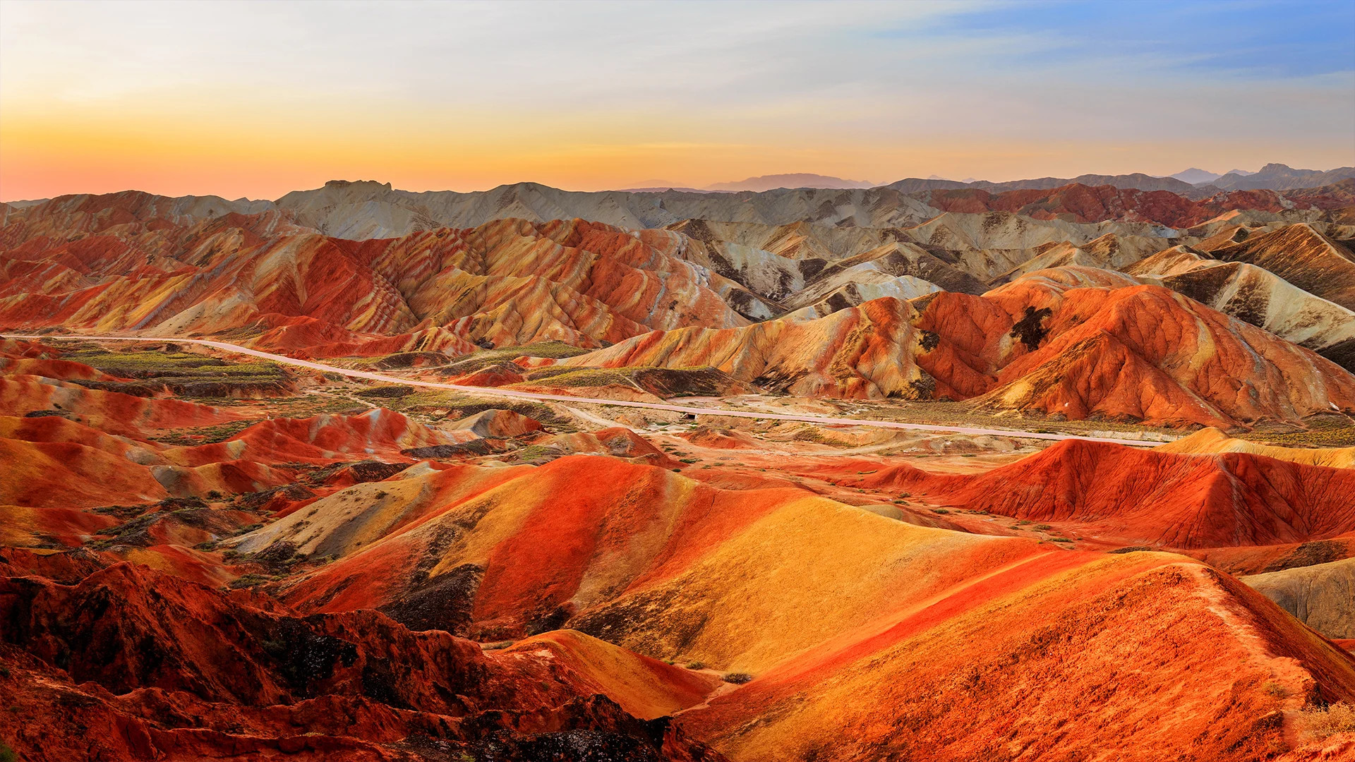 這是蘭州水墨丹霞,以絢爛色彩與柔美地貌詮釋大自然的藝術創造力。如烈火般熾熱的紅、明豔的橙、燦爛的黃交織暈染,層理如水墨般自然過渡,勾勒出群山起伏的柔美曲線。陽光傾灑下,山體明暗交織,光影在褶皺間流轉,賦予岩石靈動的生命力。廣袤的丹霞地貌延展至天際,與湛藍天空形成強烈視覺碰撞,既似大地潑墨的抽象畫作,又暗含地質演變的科學密碼,盡顯自然造化的壯美與神秘。