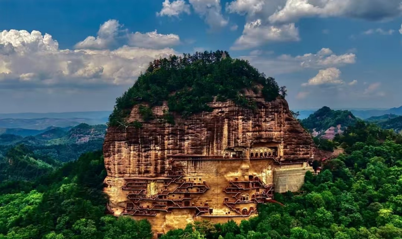 麥積山石窟位於甘肅省天水市,是中國四大石窟之一。畫面中,這座形似麥垛的孤峰拔地而起,山體表面密佈著層層疊疊的石窟群,棧道如游龍般蜿蜒纏繞崖壁,連接著數百個洞窟,展現出“峭壁之間鐫石成佛”的奇觀。石窟始鑿於北魏,以精美的泥塑藝術聞名於世,被譽為“東方雕塑館”。山體紅巖與周邊蒼翠的森林形成鮮明對比,自然景觀與人文遺產完美融合。作為世界文化遺產,麥積山不僅承載著千年佛教文化,更以獨特的建築智慧與藝術價值,成為絲綢之路上璀璨的文化地標。