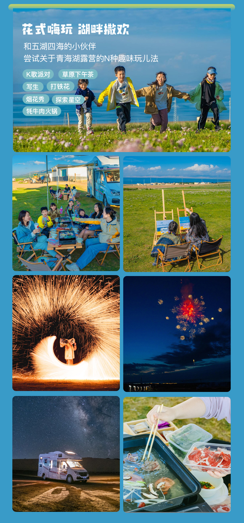 - D5:茶卡-青海湖騎行-午餐-青海湖南山全景徒步-戶外手工體驗-下午茶-草原嘉年華(放風箏/拔河)-露營火鍋-草原戶外 K 歌-甩鐵花-放煙火-草原看星星【150km/2小時】