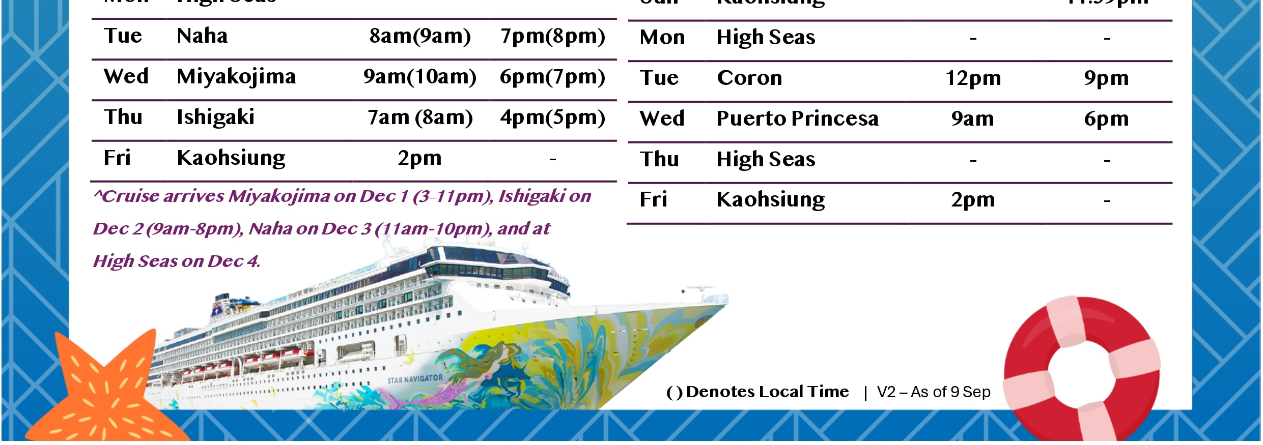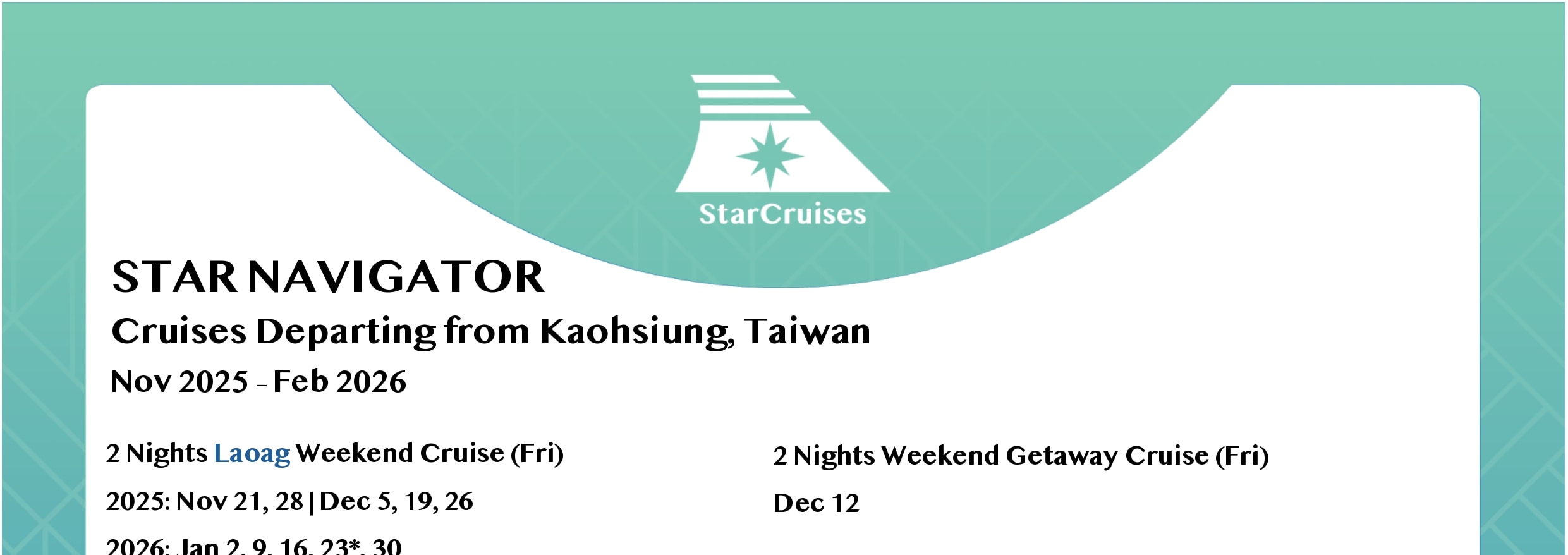 星夢郵輪將於冬季航季調整星航 Navigator 號的航線,從夏季母港基隆移至高雄營運,自2025年11月16日至2026年1月30日止,提供前往日本、越南、菲律賓的3天及6天郵輪行程。