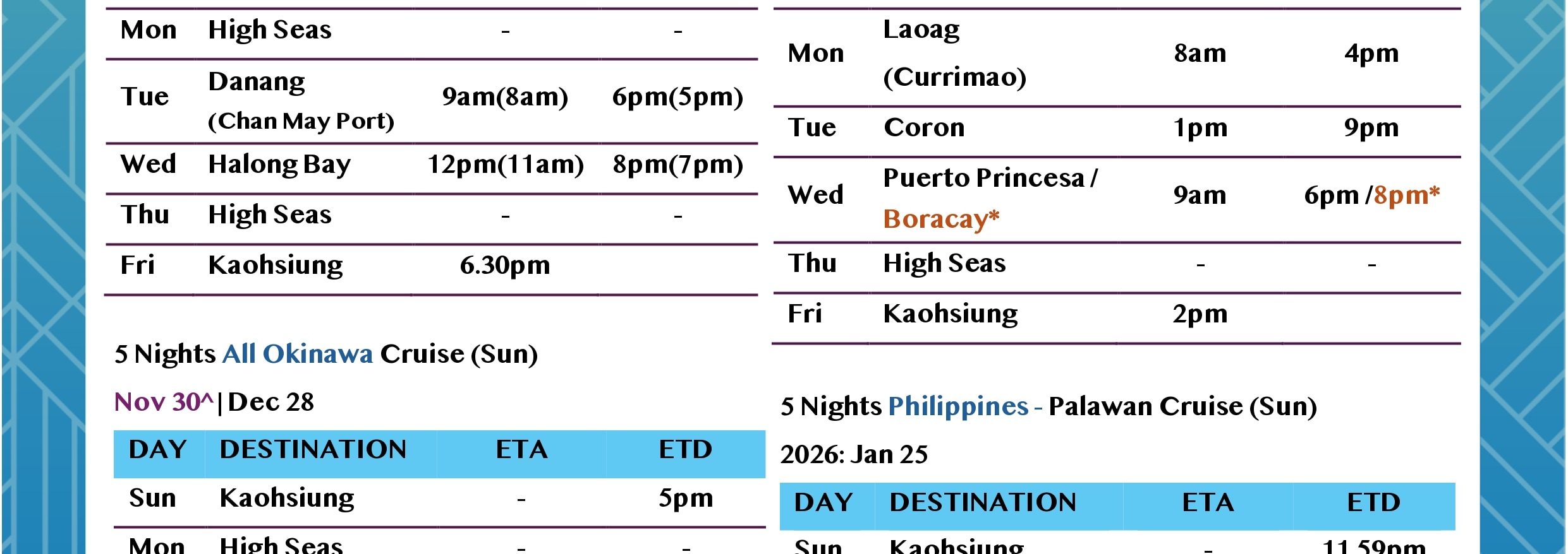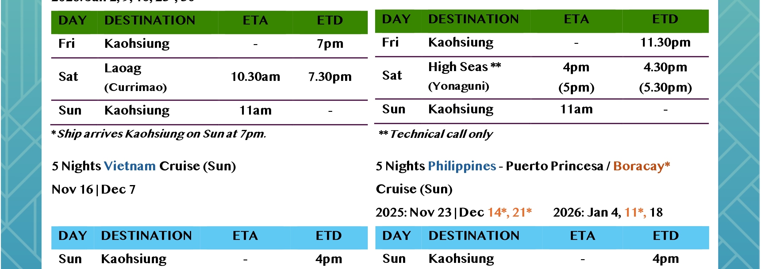 - 從 Taiwan 台灣出發時,年滿 90 歲或以上的旅客將不允許登船。