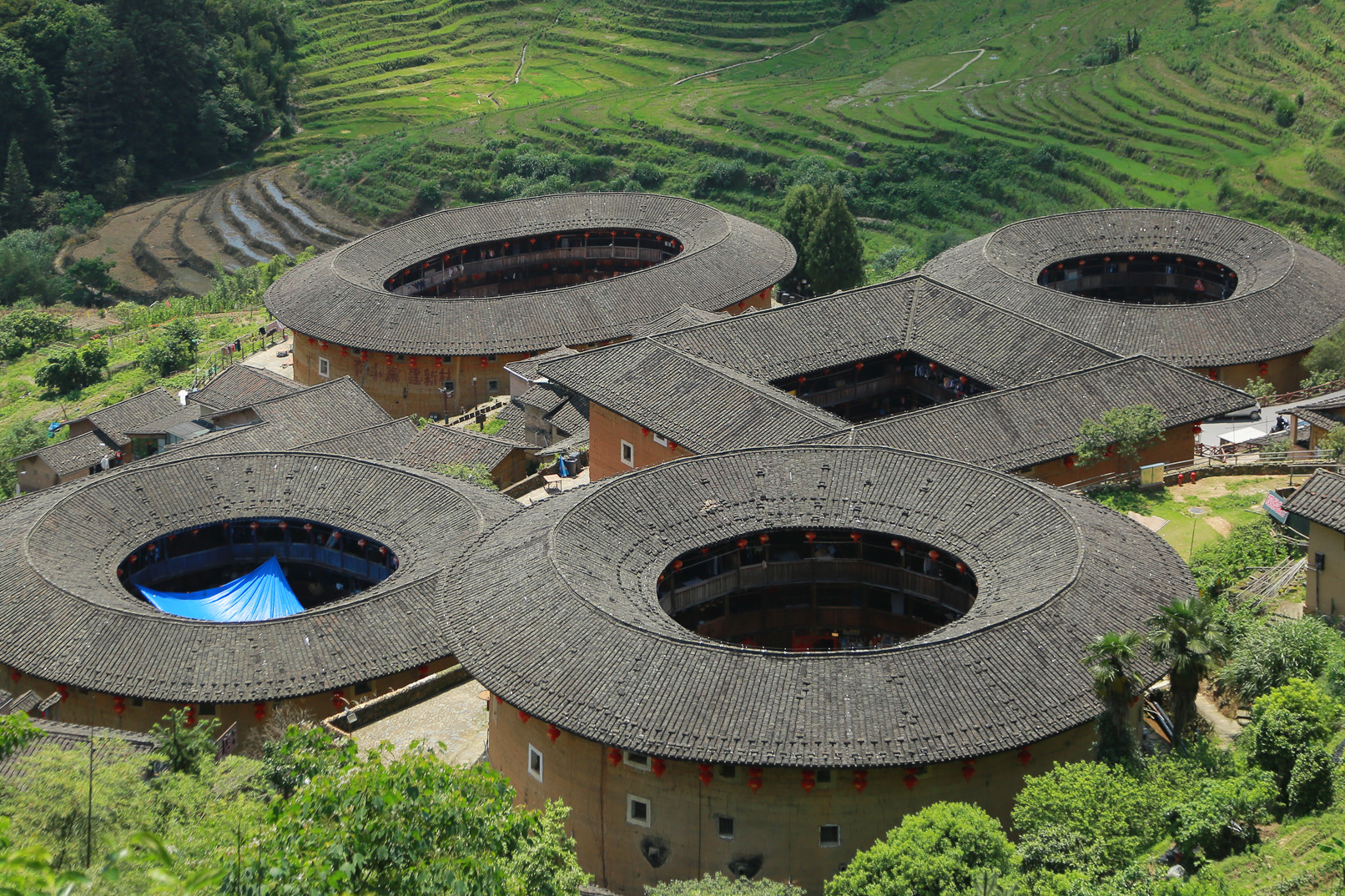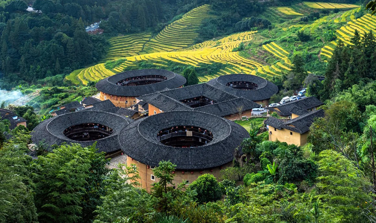 田螺坑土樓群(“四菜一湯”):5座土樓呈“三圓一方一橢圓”組合,從高處俯瞰像四菜一湯的餐桌布局,故得名。