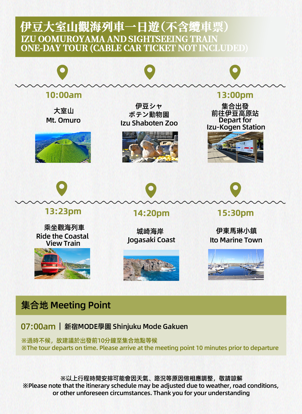 - 伊豆三景漫遊:2025年12月8日~12月19日大室山纜車停運檢修,期間將前往小室山纜車,若小室山纜車臨時停運,則前往伊豆仙人掌動物園