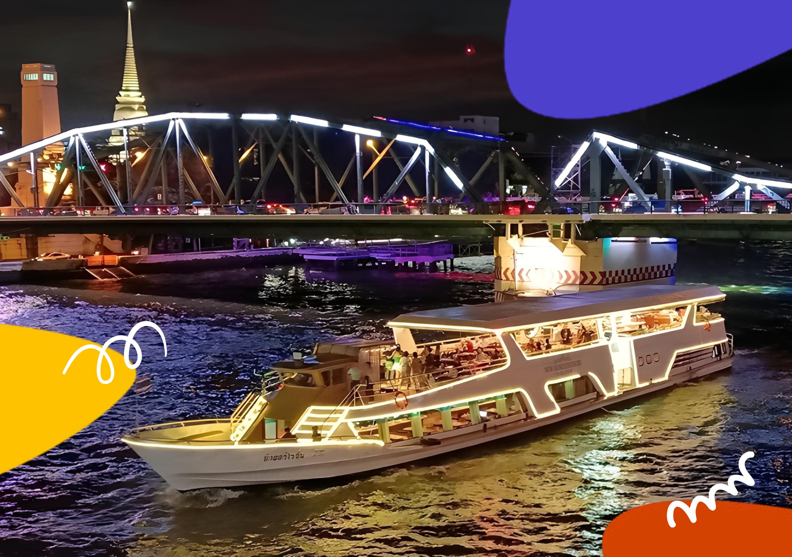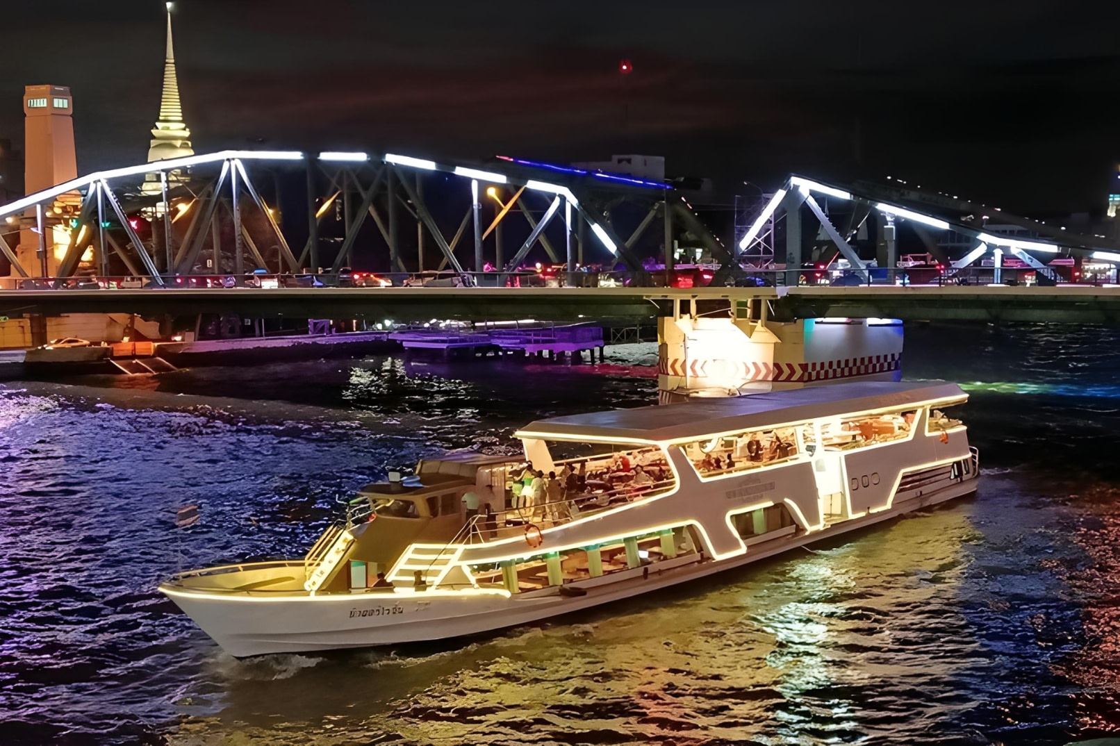 當您經過曼谷燈火輝煌的地標時,現場音樂會增添優雅的氛圍。亮點是夜晚璀璨的鄭王廟。您可以選擇開放式上層甲板欣賞全景,或在時尚的室內休息室放鬆身心。當您返回時,您將享受到一個美食、放鬆和難忘回憶的夜晚。