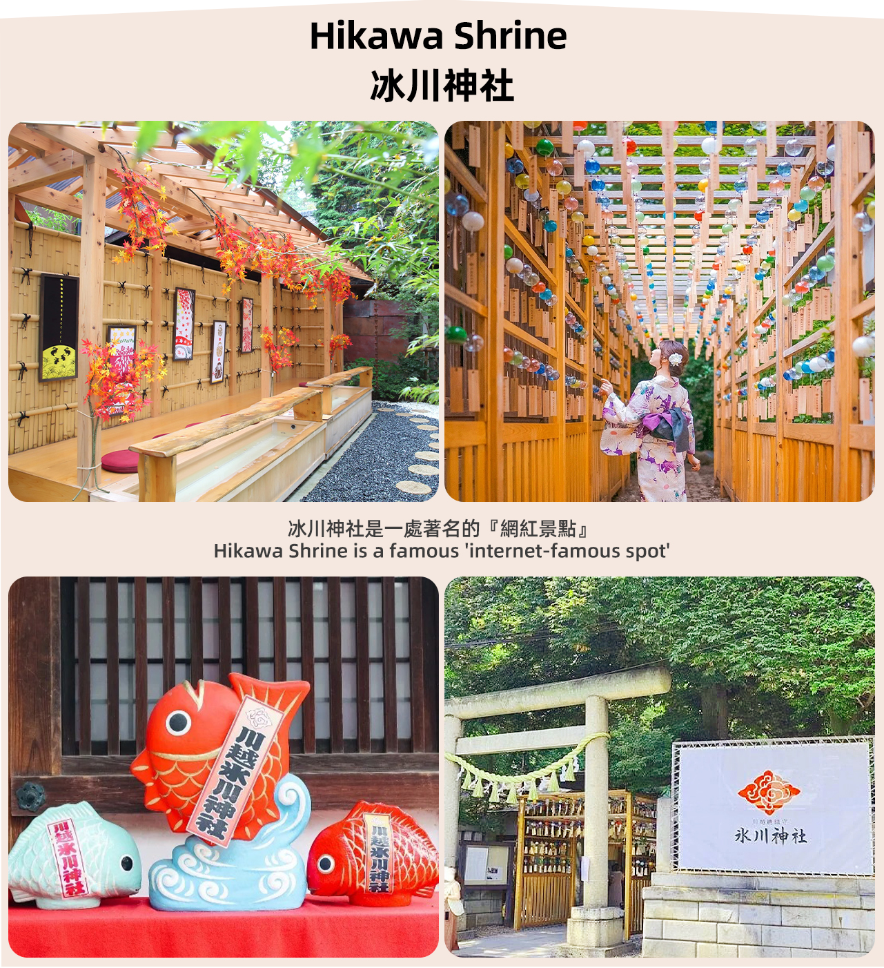 星野溫泉:擁有寬敞的室內浴場和景色宜人的露天風呂,浸泡泉水中,聆聽林間鳥鳴,感受微風拂面,是消除旅途疲憊、恢復身心的極致享受。 - 第二站:冰川神社+川越小江戶