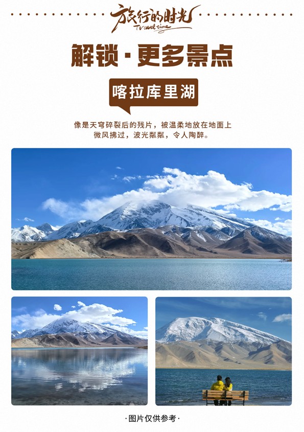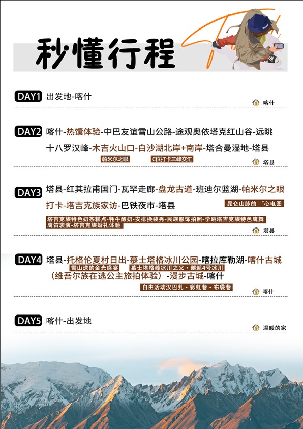 - 第四天:塔縣-託格倫夏村日出(雪山送的金光盛宴)-慕士塔格冰川公園(邂逅4號冰川)-喀拉庫裡湖-喀什古城旅拍體驗-漫步古城-喀什【華住系列近古城飯店】【車程約300KM 行車約6H】