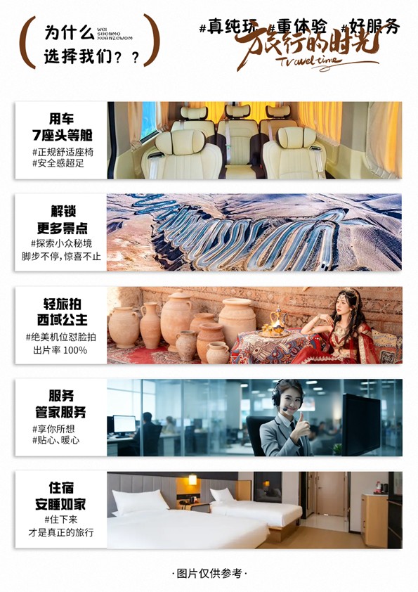 - 12.用餐時間:由於新疆和內地有2小時左右時差(但依然採用北京時間),一般早8點半左右早餐、午餐14-15點、晚餐20點左右;旅遊耗費體力,請提前自備零食。
