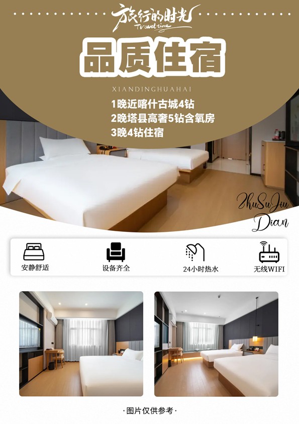 - 特別安排3晚喀什四鑽飯店+1晚喀什近古城四鑽飯店+2晚塔縣5鑽般藍飯店