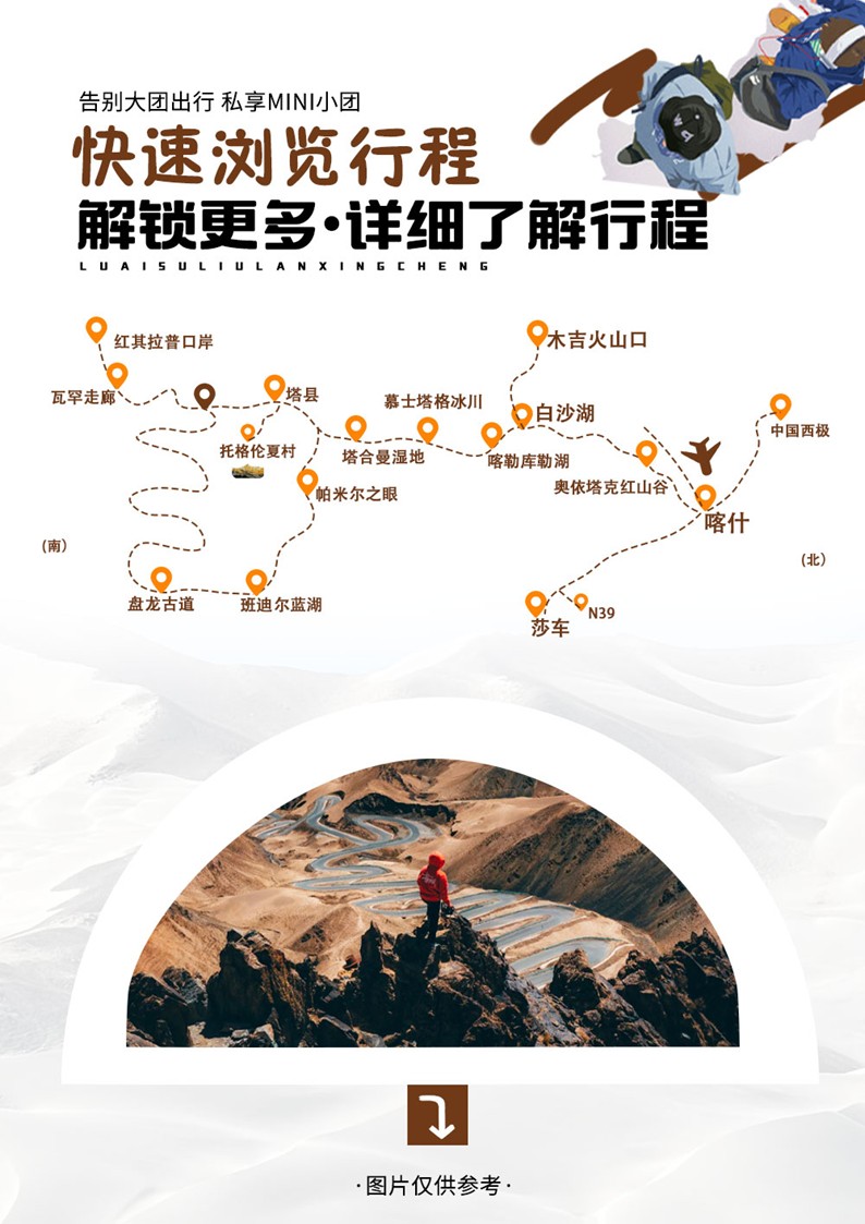 - 第二天:喀什-熱饢體驗-中巴友誼雪山公路-途觀奧依塔克紅山谷-遠眺十八羅漢峰-木吉火山口-白沙湖北岸+南岸-塔合曼溼地-塔縣【5鑽飯店】【車程約450KM行車約8H】