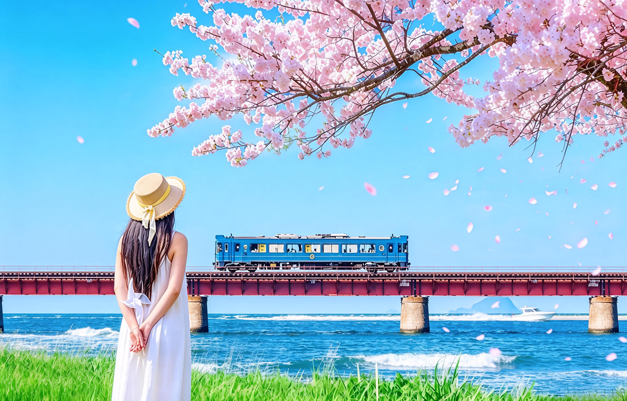- 旅程從西舞鶴站的海上列車開始。柴油列車沿著京都北部海岸緩緩前行,窗外是寧靜的漁村、低調的海灣與原始自然。當列車駛上由良川橋樑,軌道彷彿懸浮在海面之上,海天一色的畫面讓人瞬間聯想到《千與千尋》的世界,復古車廂裡多了幾分溫柔與浪漫。