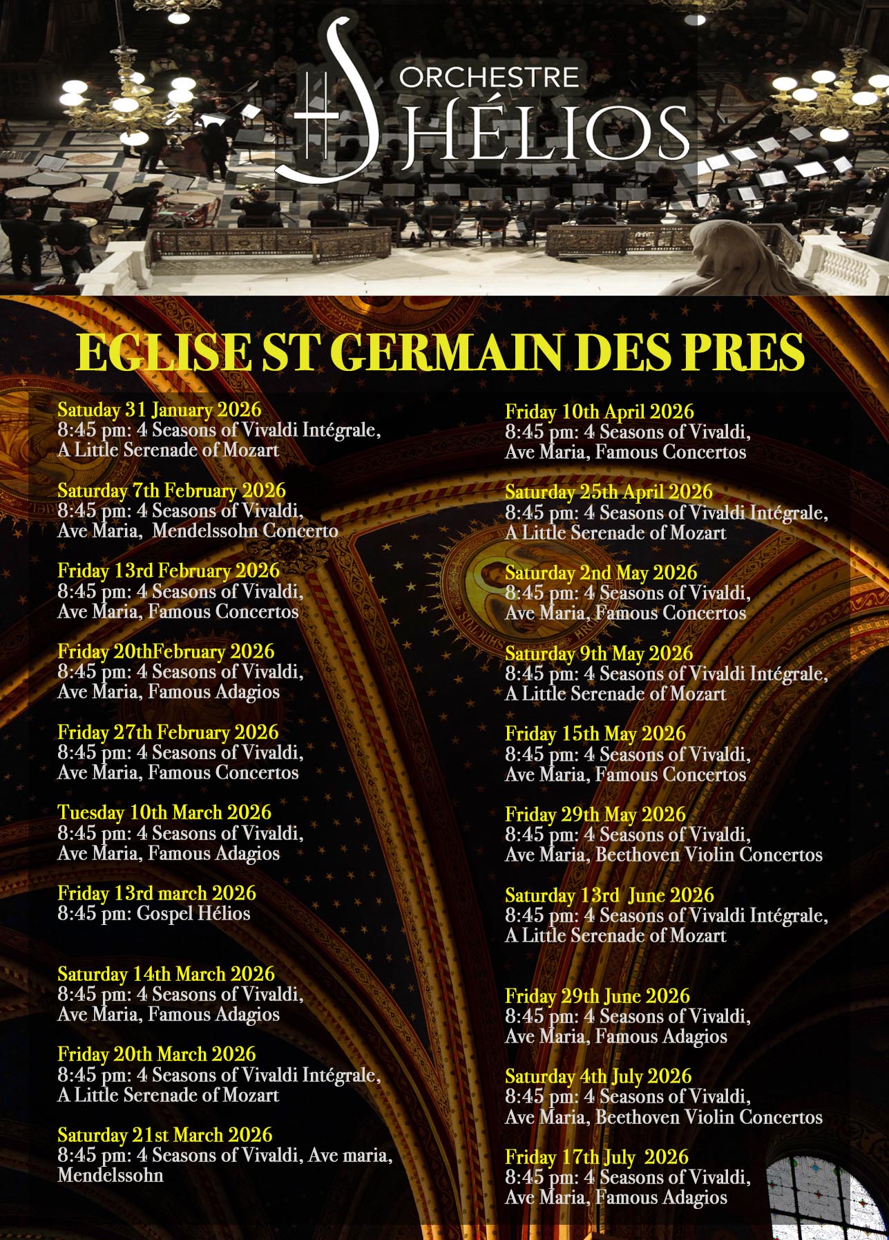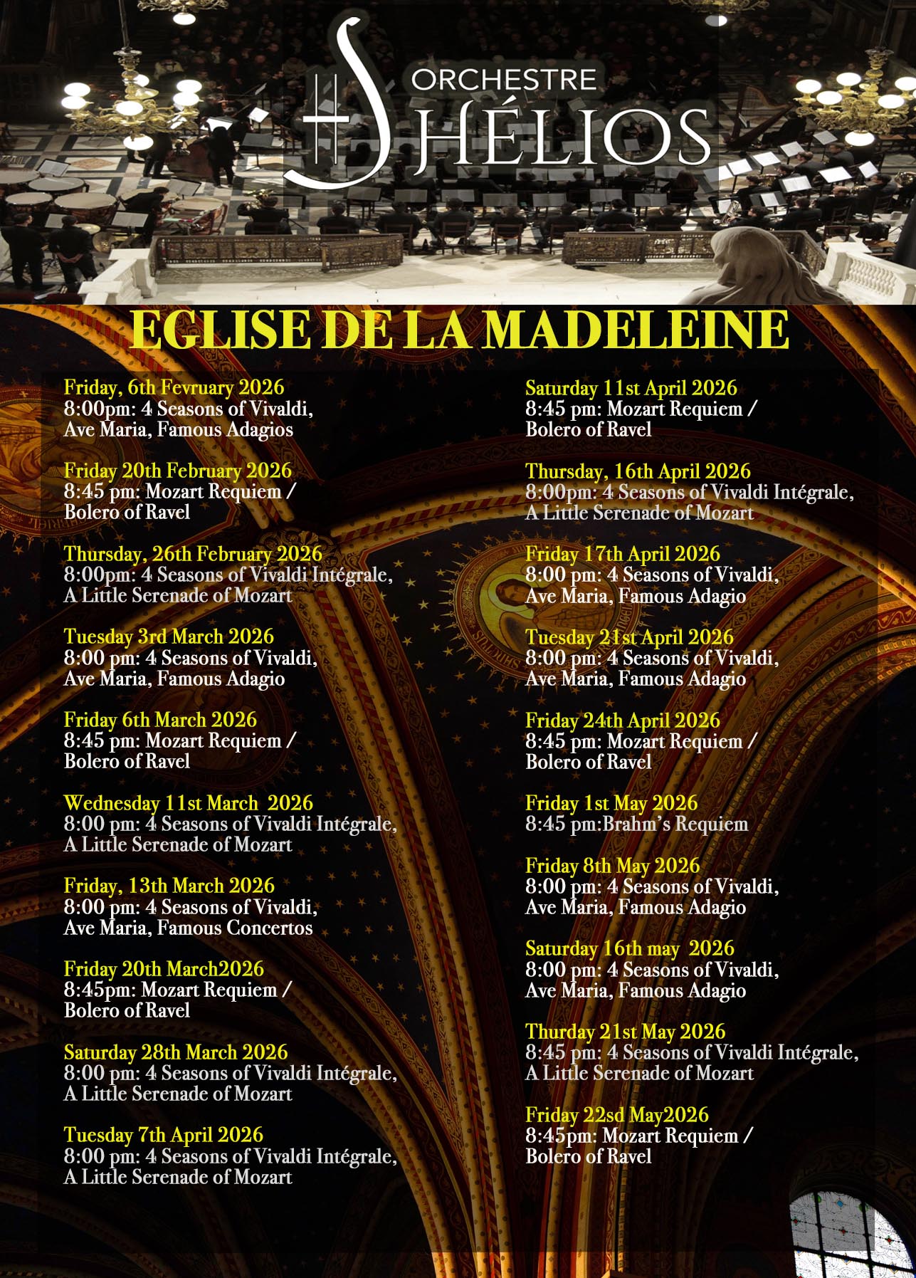 在巴黎最美麗、最具歷史意義的教堂中,享受一個迷人的古典音樂之夜。沉浸在令人驚嘆的建築和數百年的歷史氛圍中,感受與優雅音樂完美融合的體驗。由備受讚譽的Helios樂團在Paul Savalle的指導下演出,每場音樂會都匯集了才華洋溢的年輕藝術家和經驗豐富的音樂家,共同創造豐富且鼓舞人心的表演。自2014年成立以來,該樂團以融合傳統與現代表現手法而聞名,為古典傑作帶來了嶄新的詮釋。無論您是古典音樂愛好者,還是僅僅尋求獨特的文化體驗,這場音樂會都將在巴黎市中心為您帶來一個難忘的夜晚。