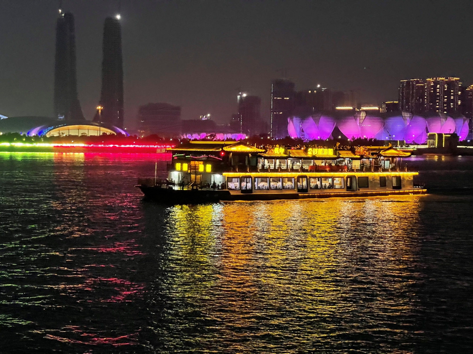 - 從濱江碼頭登船,途經錢江龍、杭州印、西興大橋、奧體中心、錢江世紀城等地標,欣賞錢江新城燈光秀,遠眺復興大橋與錢王射潮,再返回碼頭。夜幕下的兩岸高樓與霓虹交織,展現獨特的錢塘風情