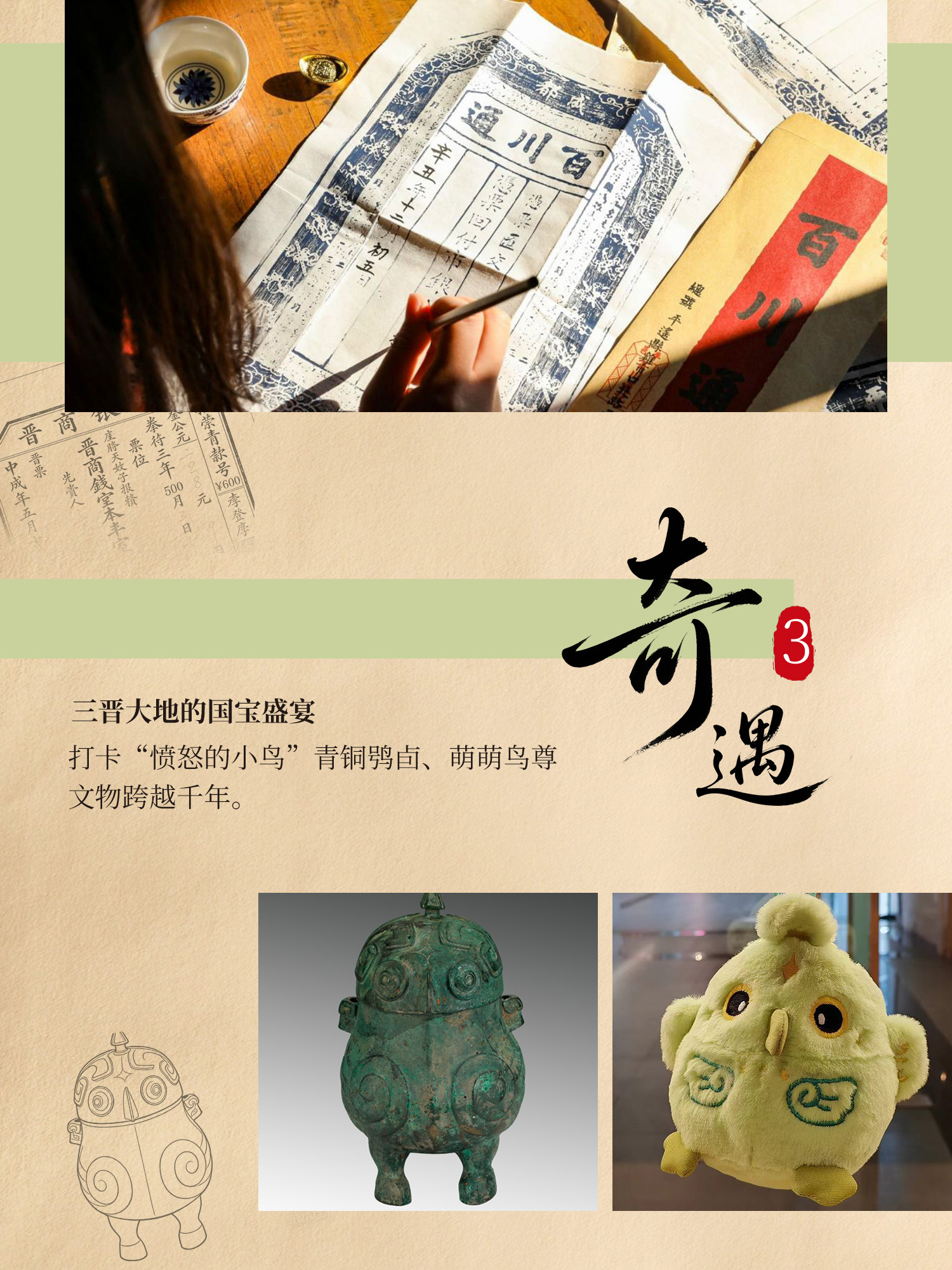 - 奇遇3【三晉大地的國寶盛宴】自遠古時代開始,瞭解這個自帶“神秘濾鏡”的省份,感受一件件文物中漢民族和遊牧民族不同的生活習性。打卡三晉大地的硬核“網紅”,萌萌的鳥尊,酷似“憤怒的小鳥”的青銅鴞卣,每一件文物都跨越千年。