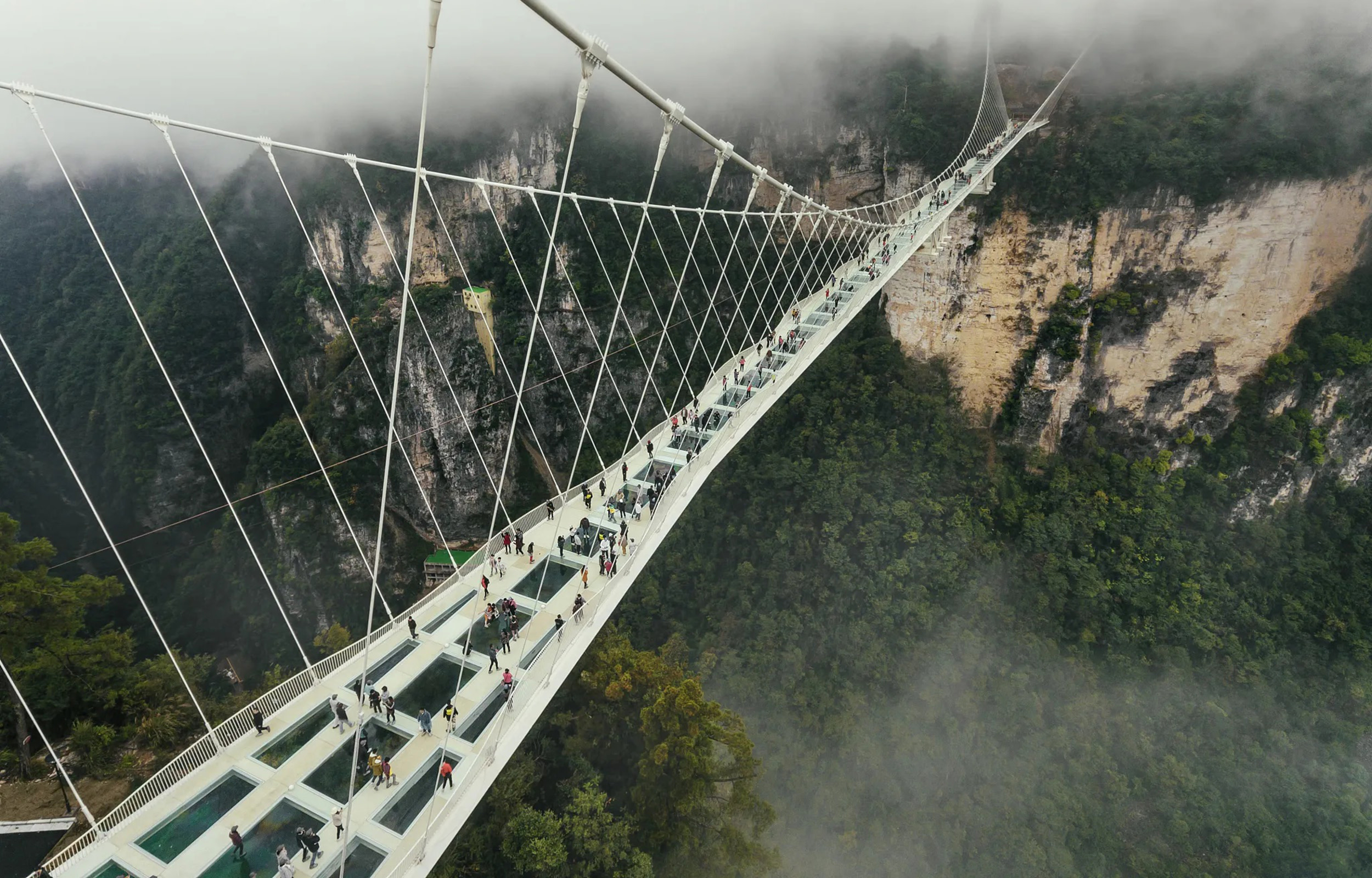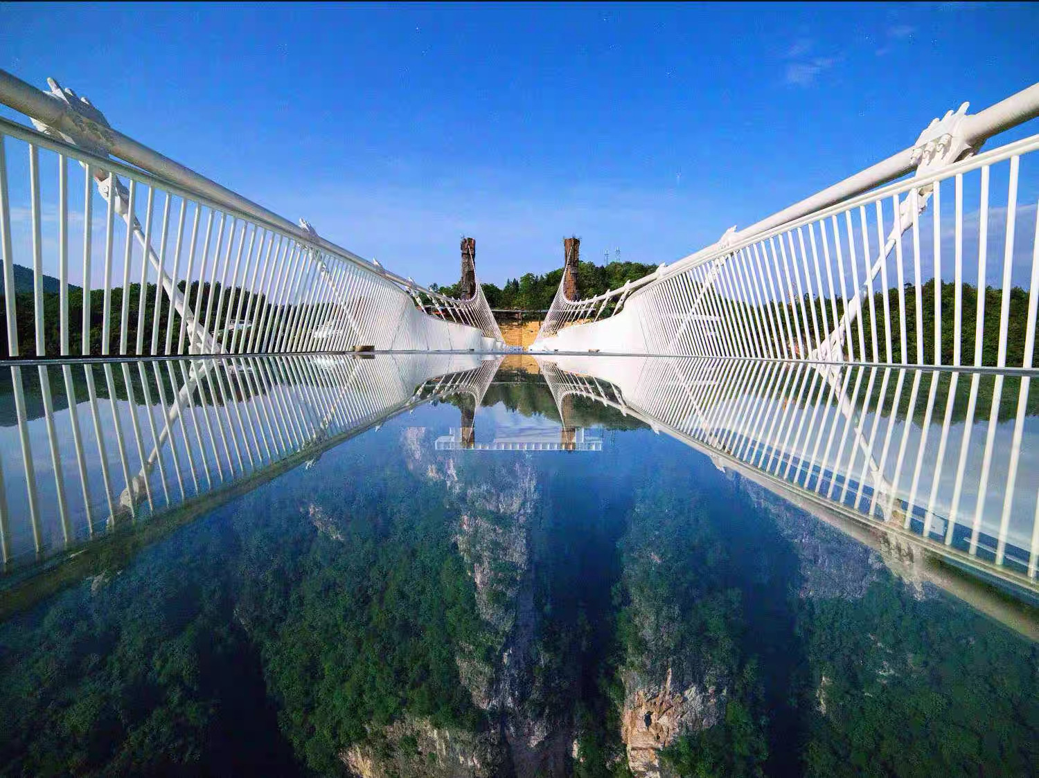 景點張家界大峽谷雲天渡玻璃橋採用透明玻璃材料,整座橋樑與周邊環境相互融合。全橋具有跨度大、橋面窄、重量輕和梁高低等特點,集人行道、遊覽、高空彈跳、溜索以及舞臺等功能為一體,為全球首座空間索麵大張開量懸索橋和以玻璃為主要受力結構的大型橋樑。 其獨特造型創新設計,體現以《老子》中“大音希聲,大象無形”的哲學美學思想進行的文化理念和定位。