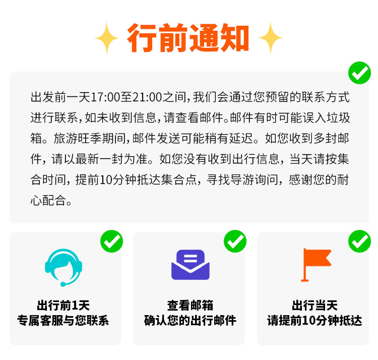 - 供應商會在出行前一天20點前發送次日出行的車輛資訊和導遊資訊到您的郵箱,請您注意查看(可能會在垃圾箱)。為了確保順利出行,請您一定要及時聯絡導遊或者司機。謝謝