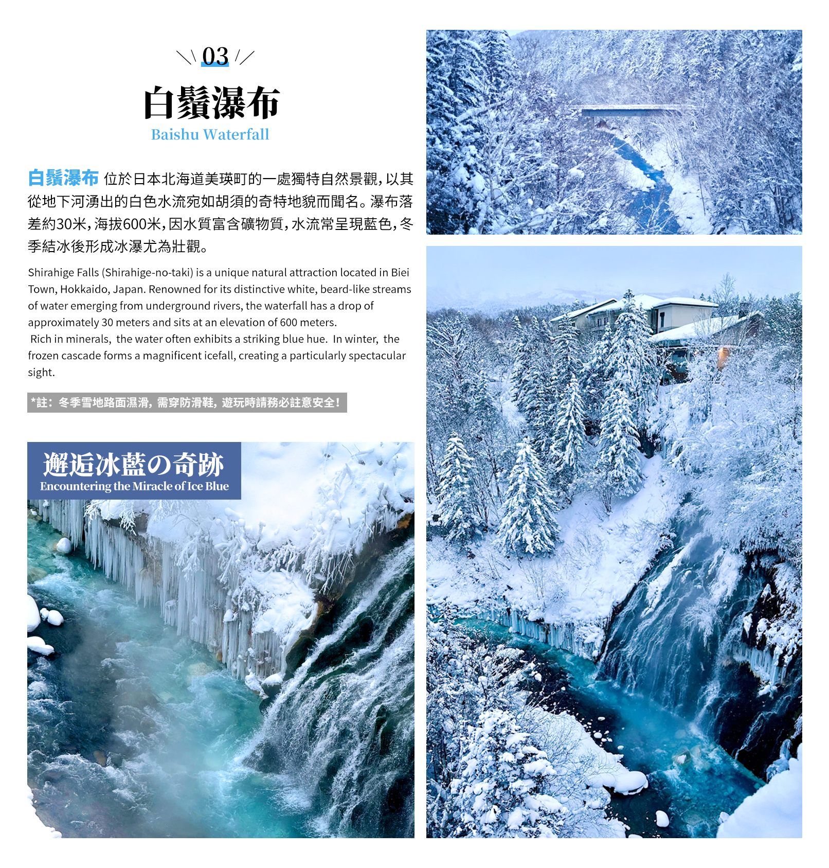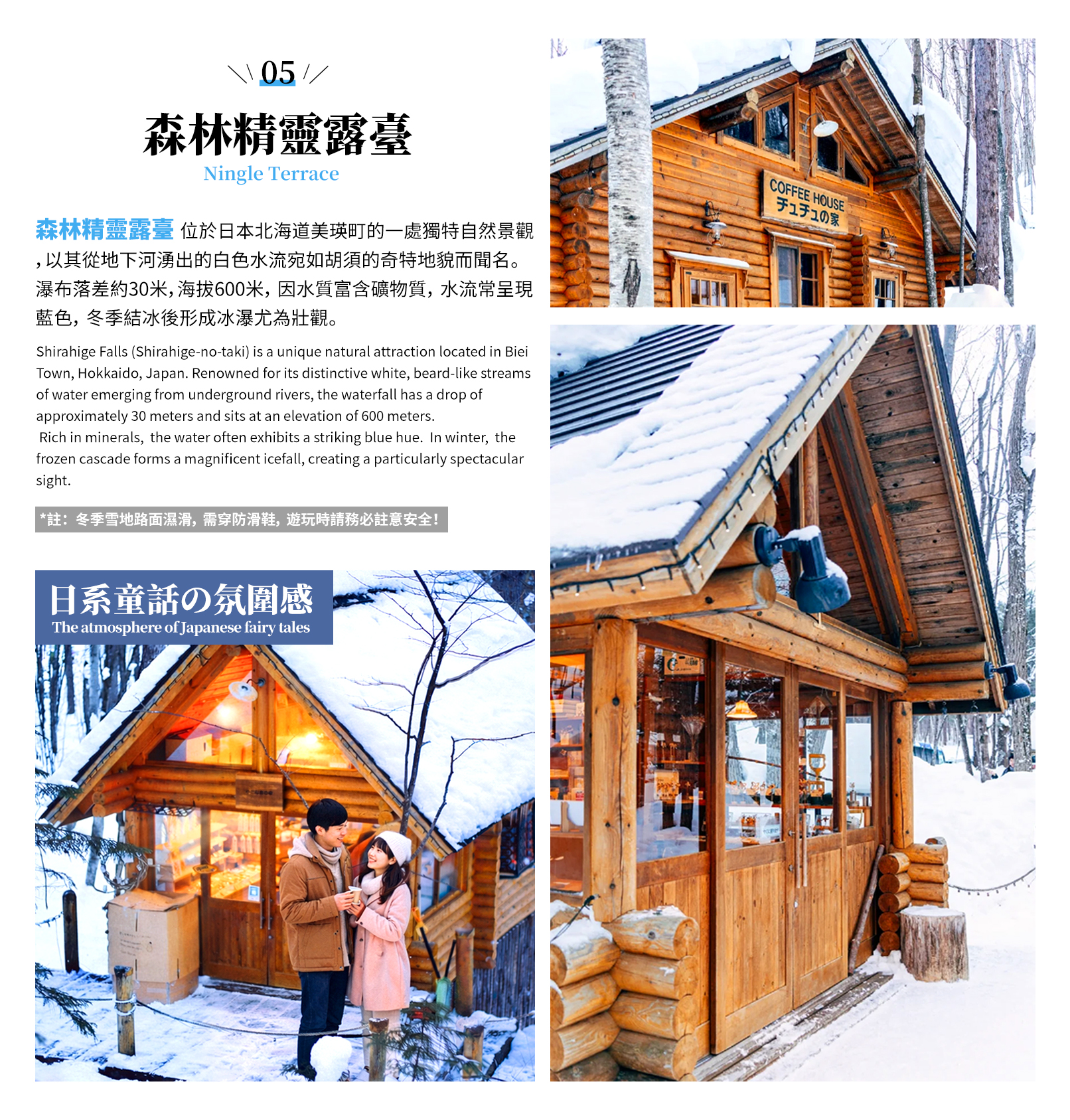 溫馨提示:冬季出行遊玩請自備防滑鞋、保暖衣物等,雪天路面溼滑積雪嚴重,請務必注意安全!