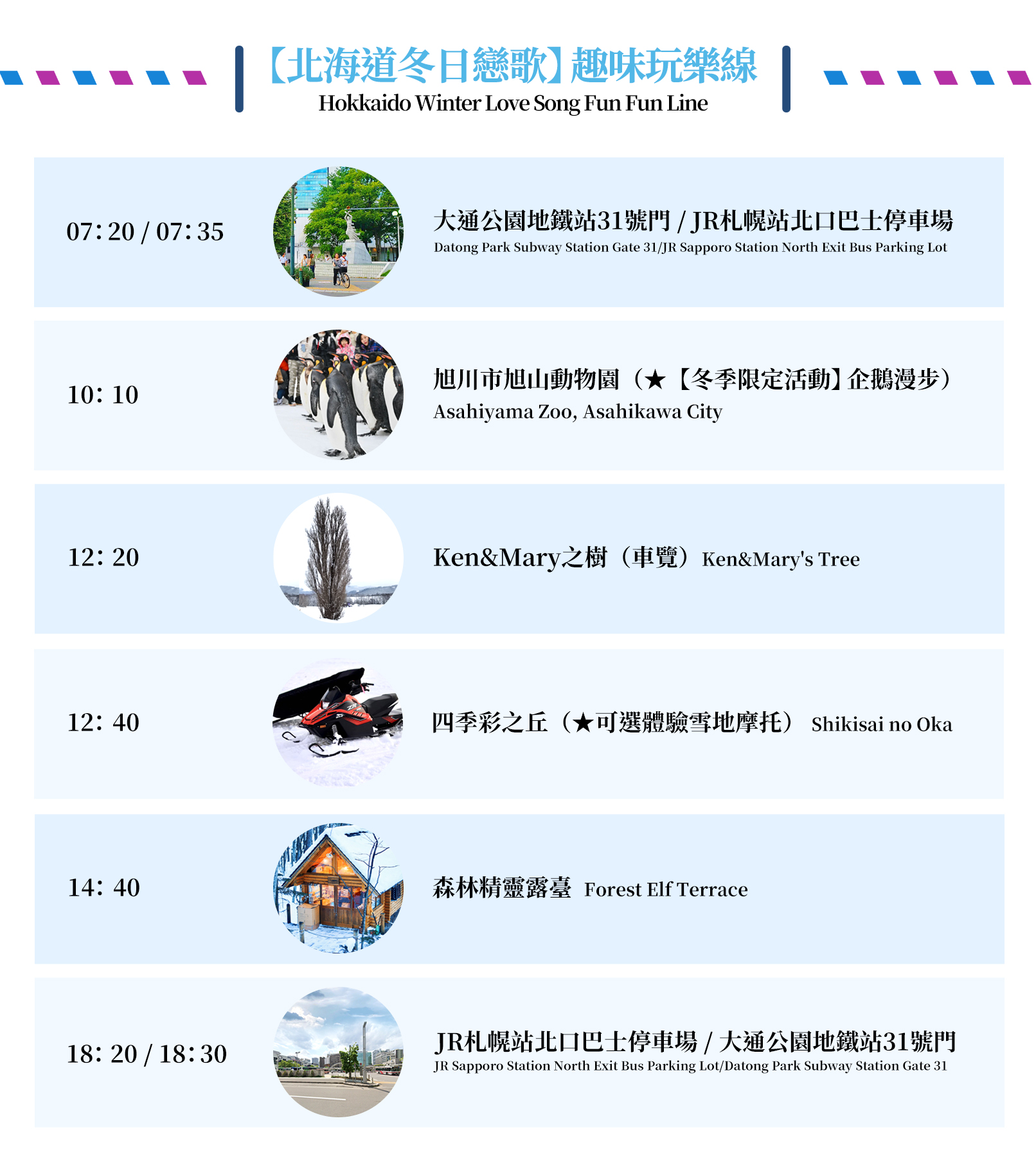 【趣味玩樂線】:①旭山動物園-②Ken&Mary之樹(車覽)-③四季彩之丘(可選體驗雪地摩托)-④森林精靈露臺(如遇週末及紅日子改去遊覽【拓真館】)。