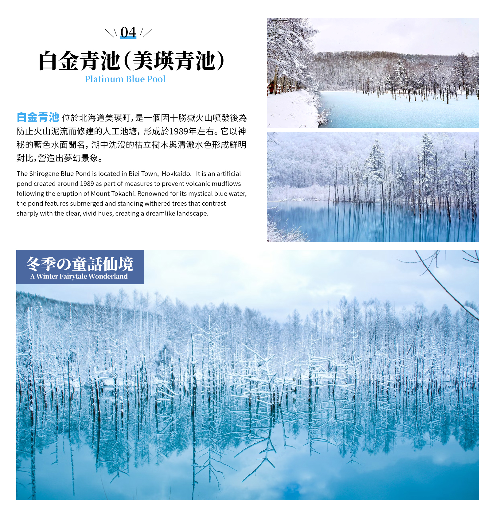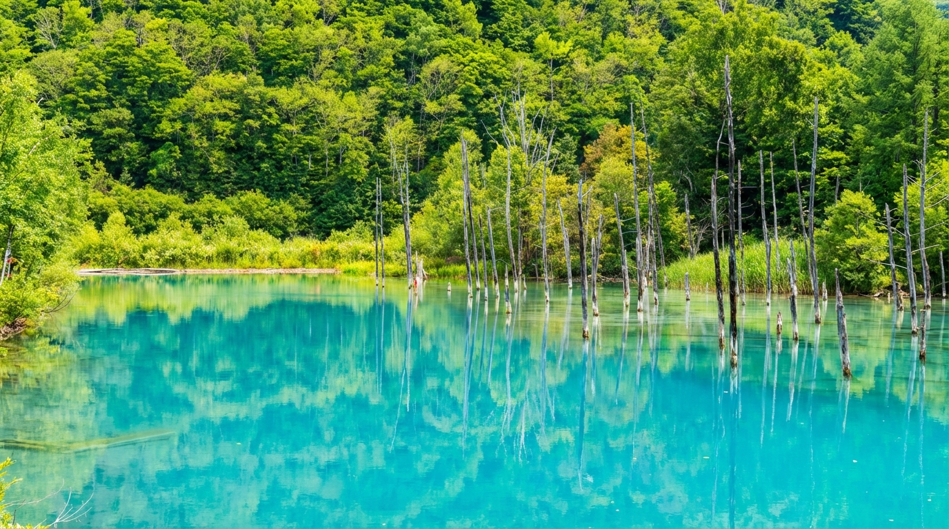 美瑛青池(白金青池):北海道的知名觀光地,池水在低溫下逐漸結冰,形成如鏡面般的冰面。感受冰雪覆蓋的靜謐之美。