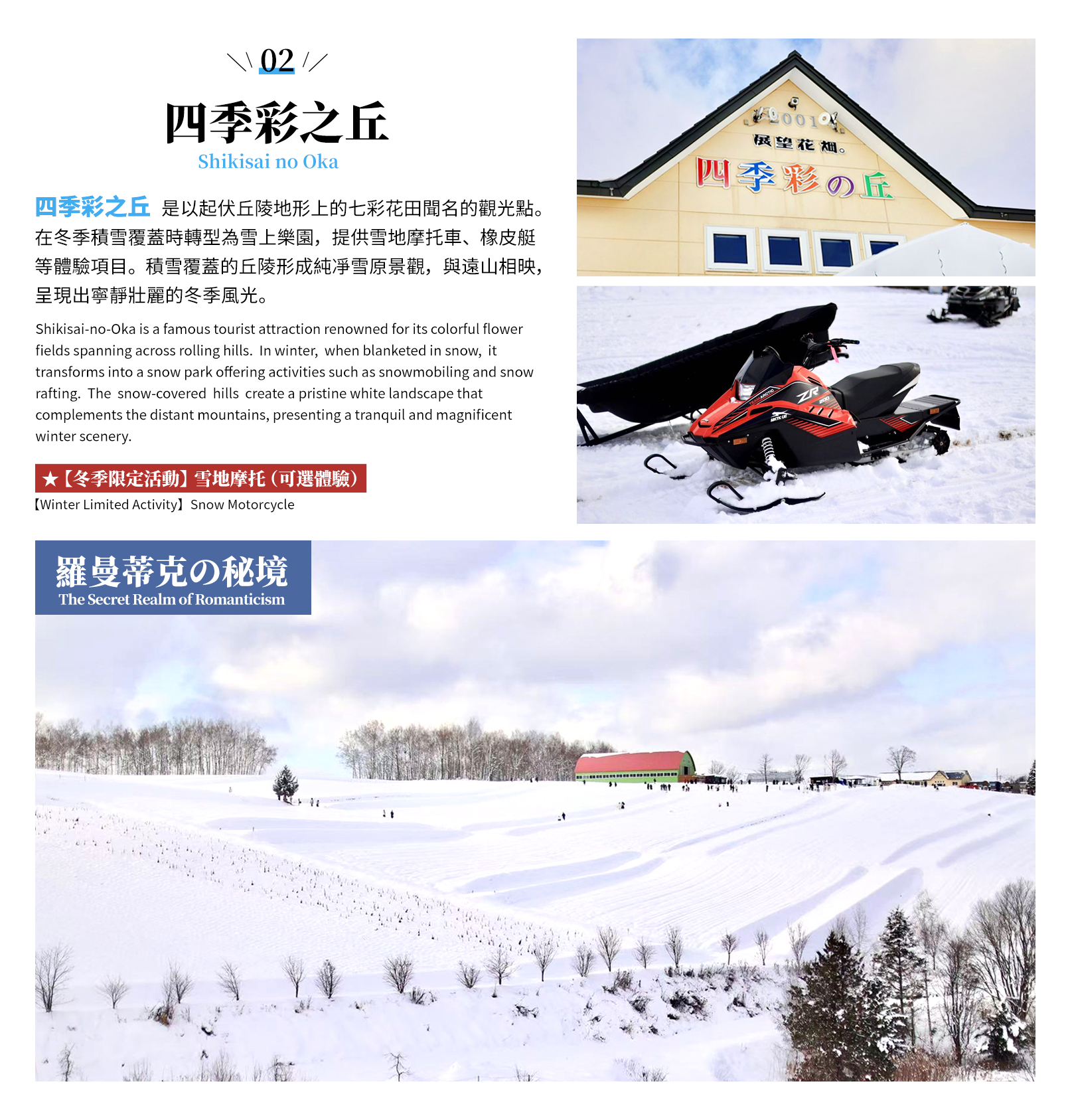- 冰之夢幻原野:冬季的《四季彩之丘》,它化身為一個銀裝素裹的仙境,遠眺一望無際的皚皚白雪,近覽眼前的無垠斑斕,可自費體驗雪地摩托。
