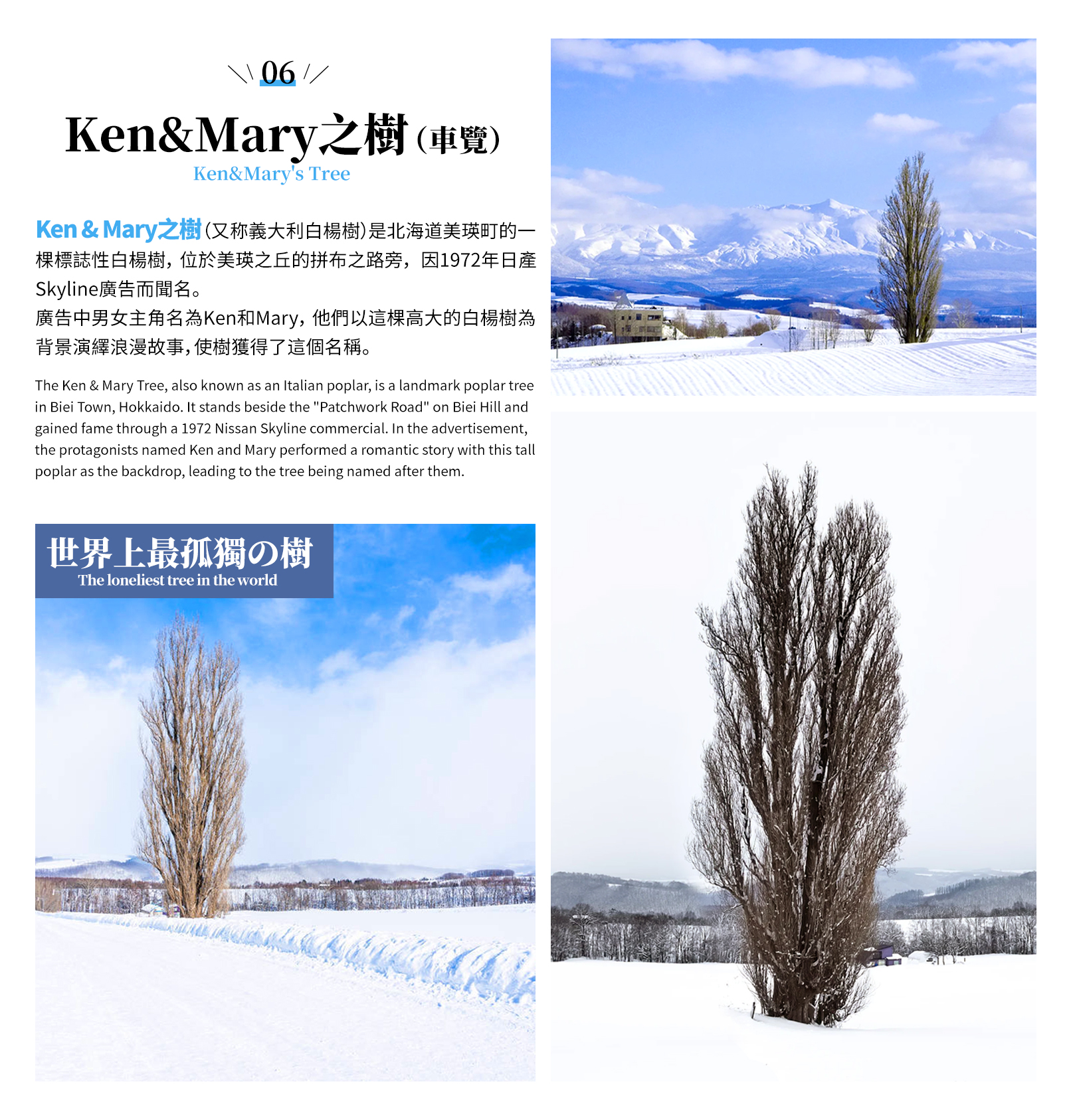 - 雪原上的孤獨浪漫:車覽冬日裡的《Ken&Mary之樹》,它是北海道冬季風光的經典象徵。