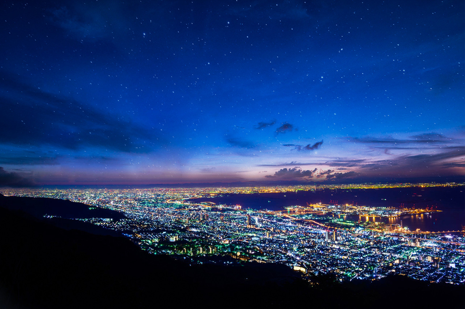 傍晚登上六甲山,俯瞰神戶港與大阪灣。