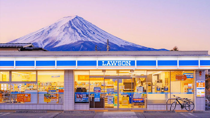 午後,巴士抵達河口湖網紅便利店。這家便利店因能將富士山與店鋪招牌同框而走紅,推開玻璃門,抬頭便能望見巍峨的富士山矗立在藍天之下。