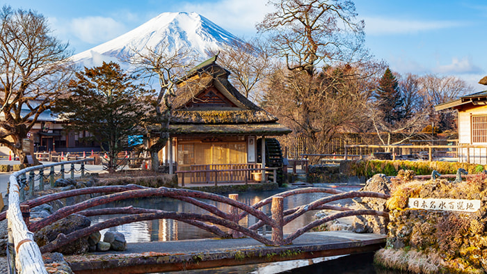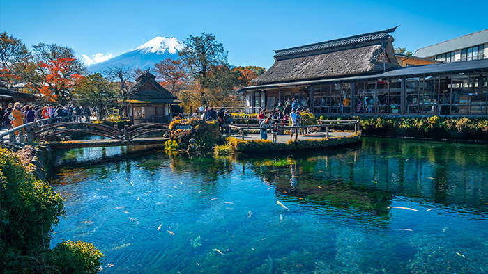 離開奧特萊斯,巴士前往有著 “日本九寨溝” 之稱的忍野八海。這處千年古村環繞著八個清澈的湧泉,泉水源自富士山積雪融化,水質清冽甘甜。