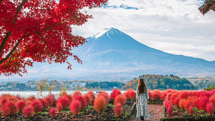 行程的最後一站,是河口湖畔的大石公園。這裡是觀賞富士山與河口湖同框的絕佳地點,園內的櫻花樹(春季)、紅葉(秋季)與富士山相映成趣,標誌性的 “富士山、河口湖、櫻花 / 紅葉” 組合,構成一幅絕美畫卷。