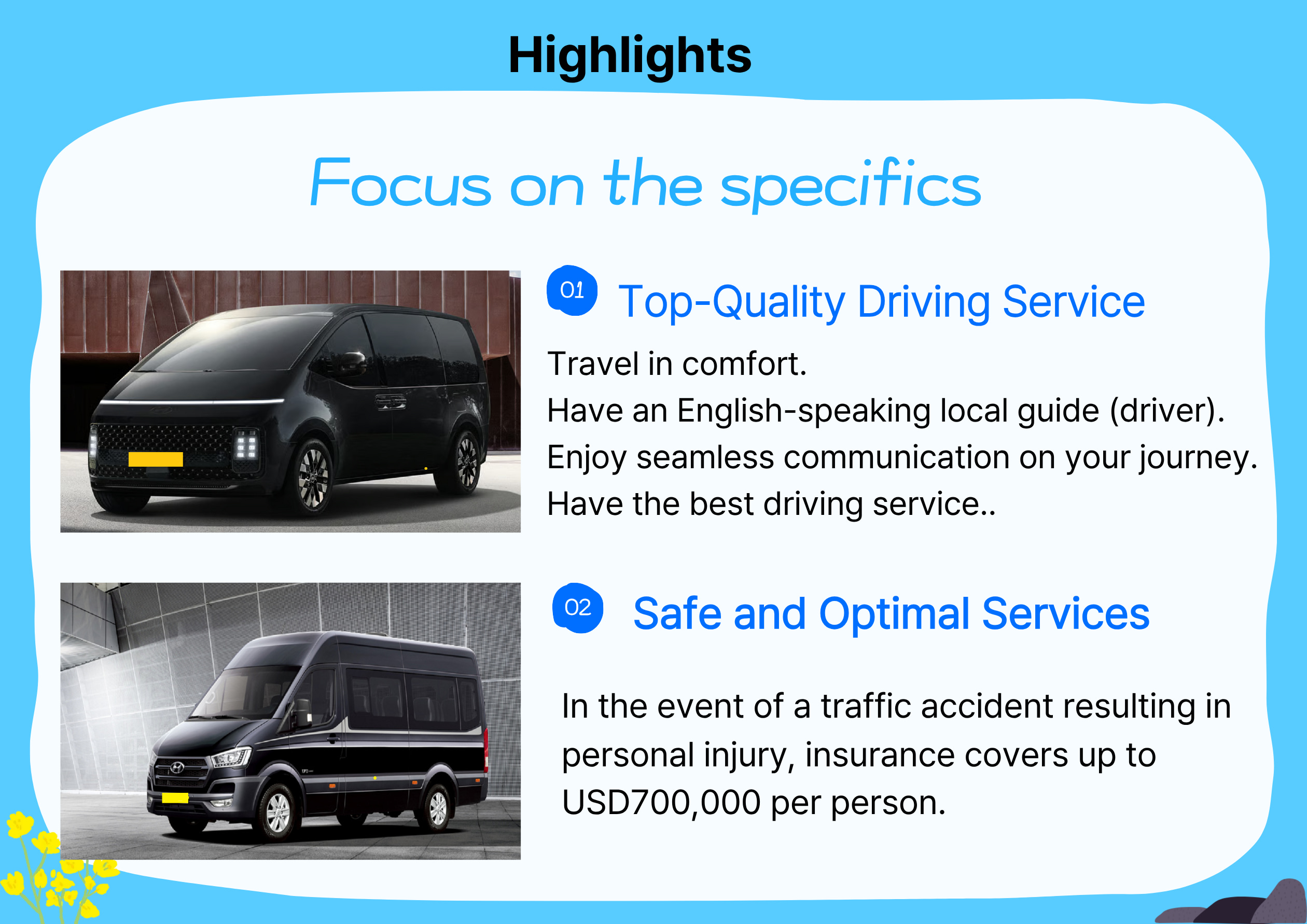 - 彈性租用時數:包車服務,提供當地導遊(司機)。可選擇包車 5 或 9 小時,讓您自由規劃行程,我們也將提供安全且優質的服務。