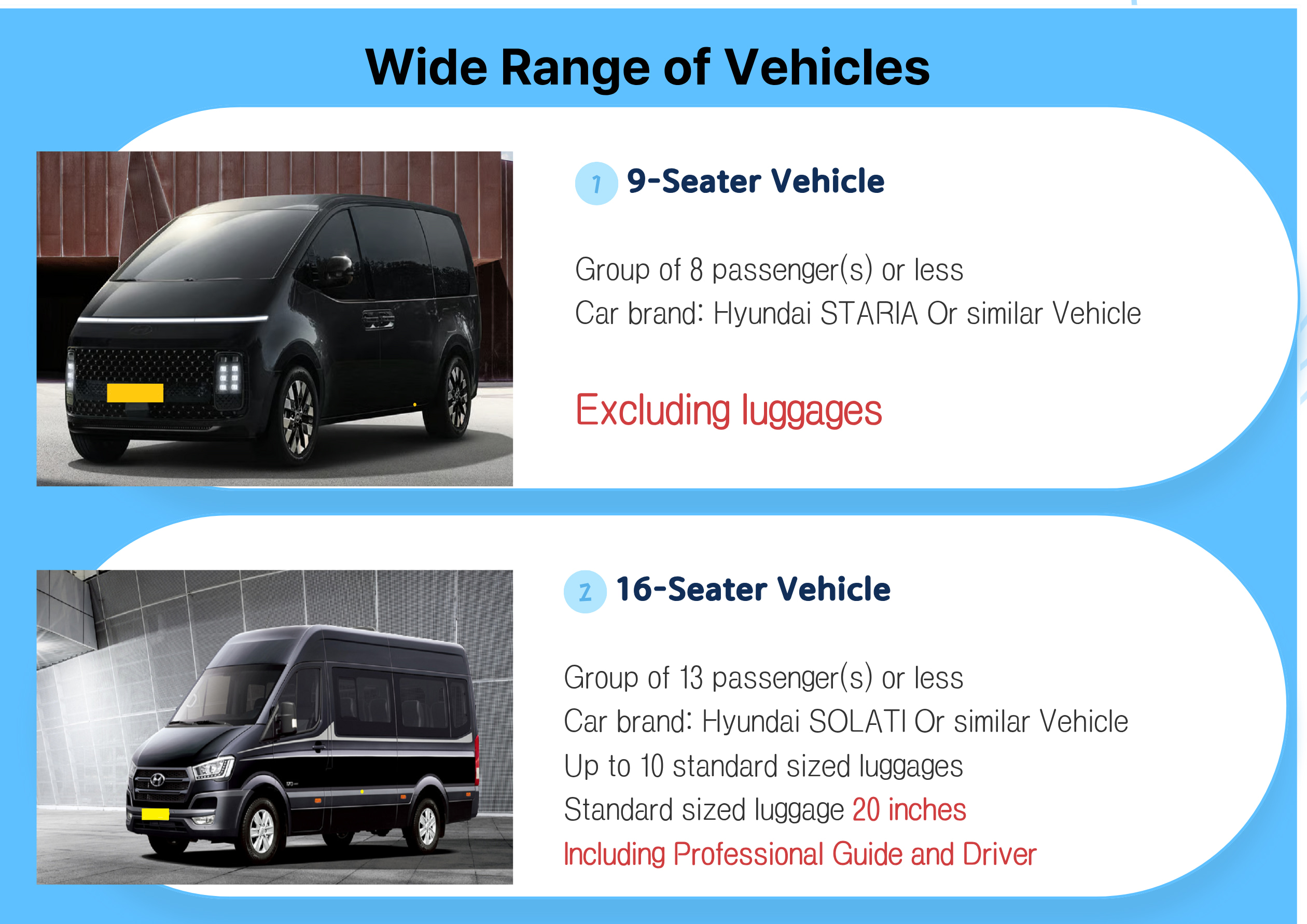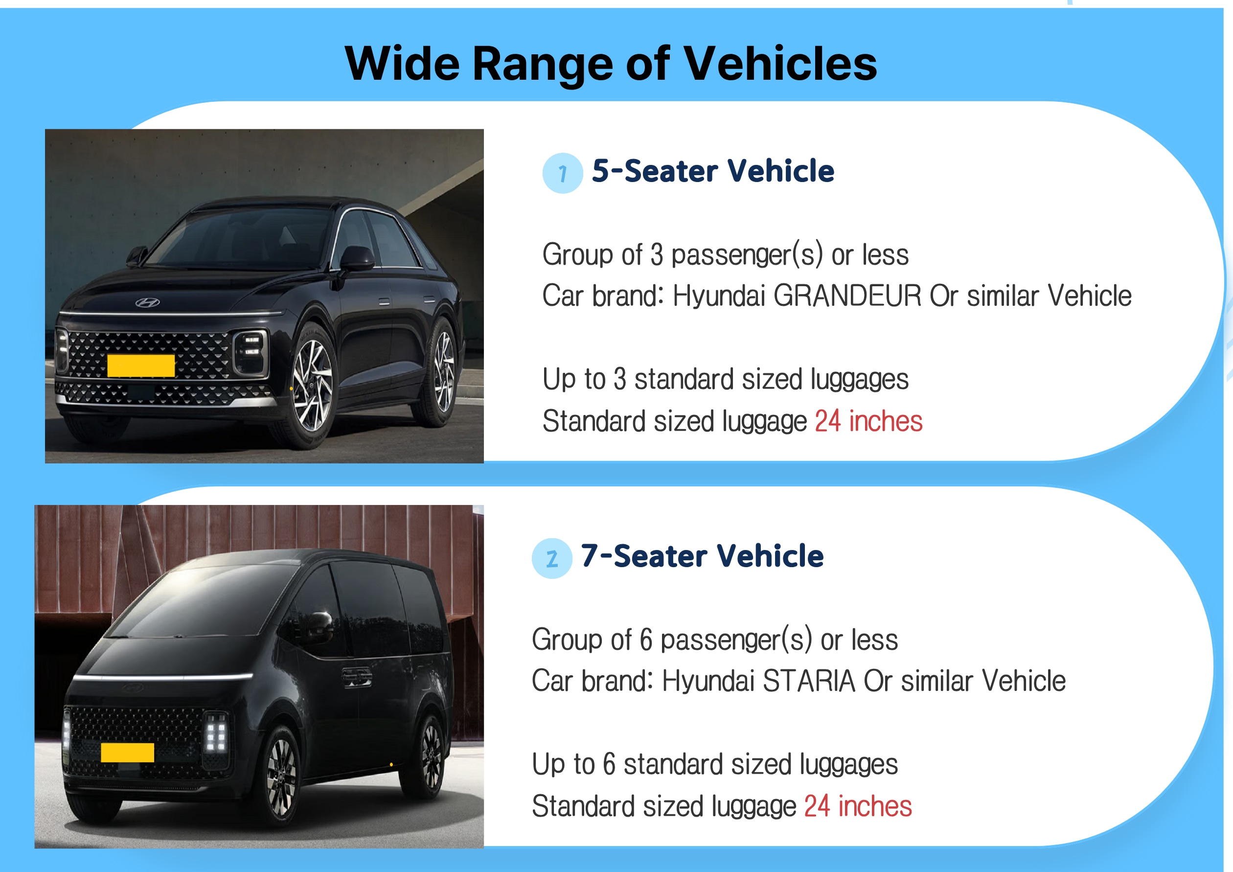 - 預訂前請確認行李容量;額外行李可能需要更大的車輛(需額外收費)