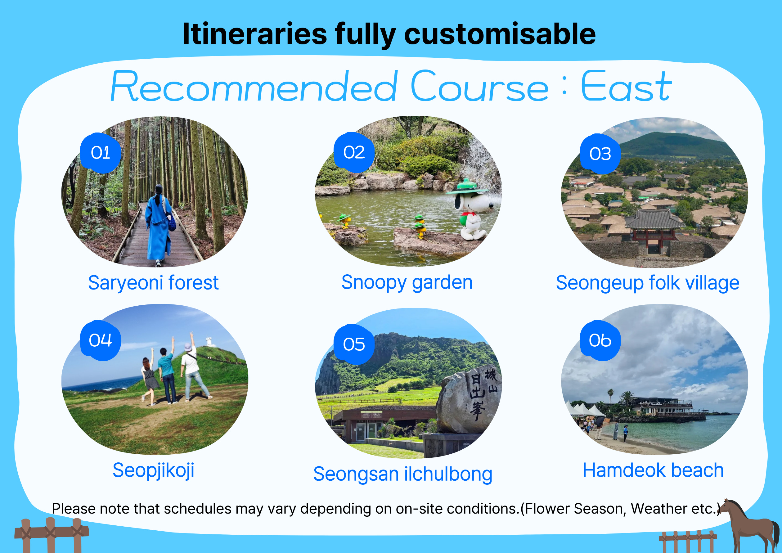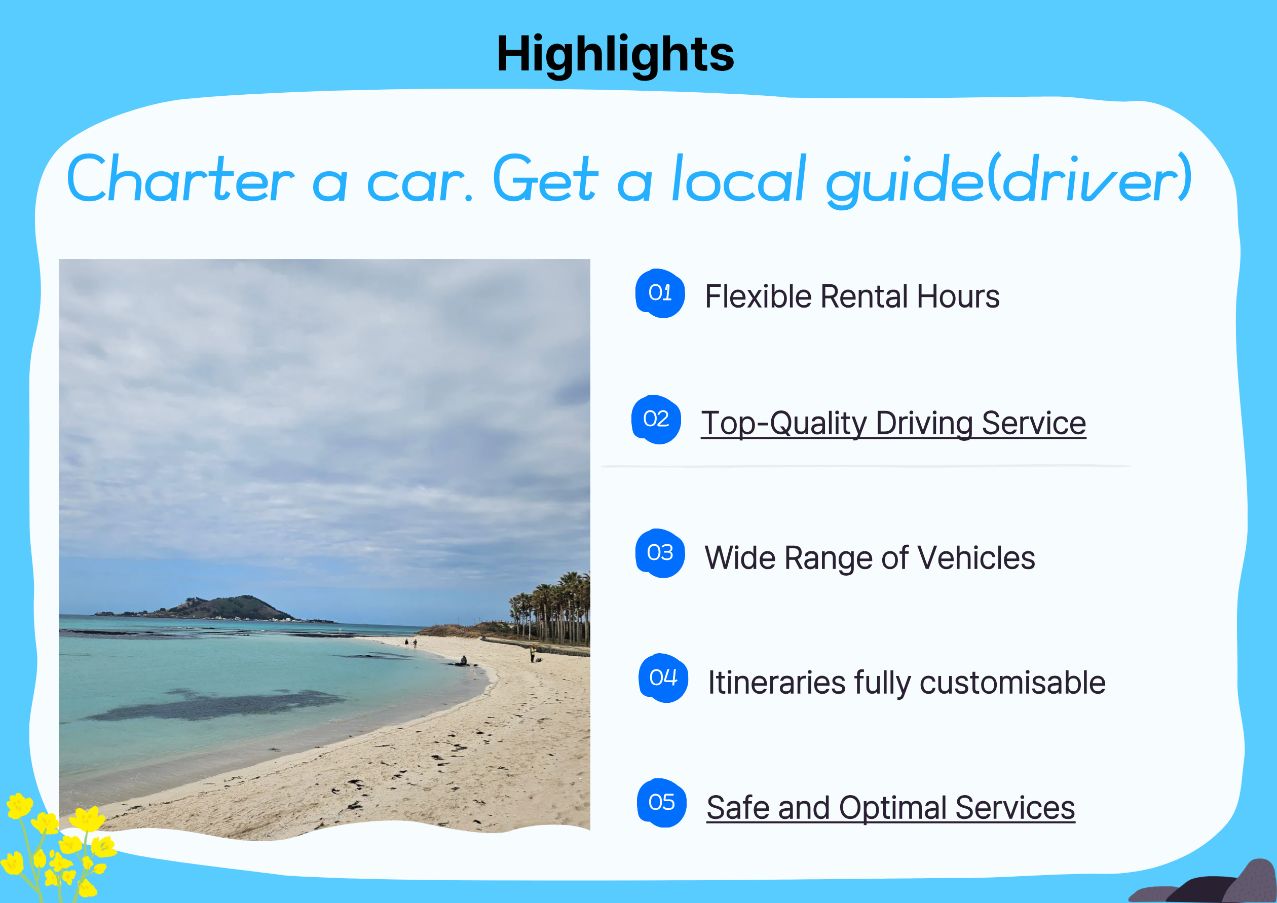 預訂私人包車,讓專業在地司導帶你暢遊濟州島!行程隨心所欲,一天內輕鬆玩遍濟州各大景點,享受專屬的步調與舒適。彈性安排行程,路線規劃高效,大幅縮短交通時間,最大化你的旅遊體驗。