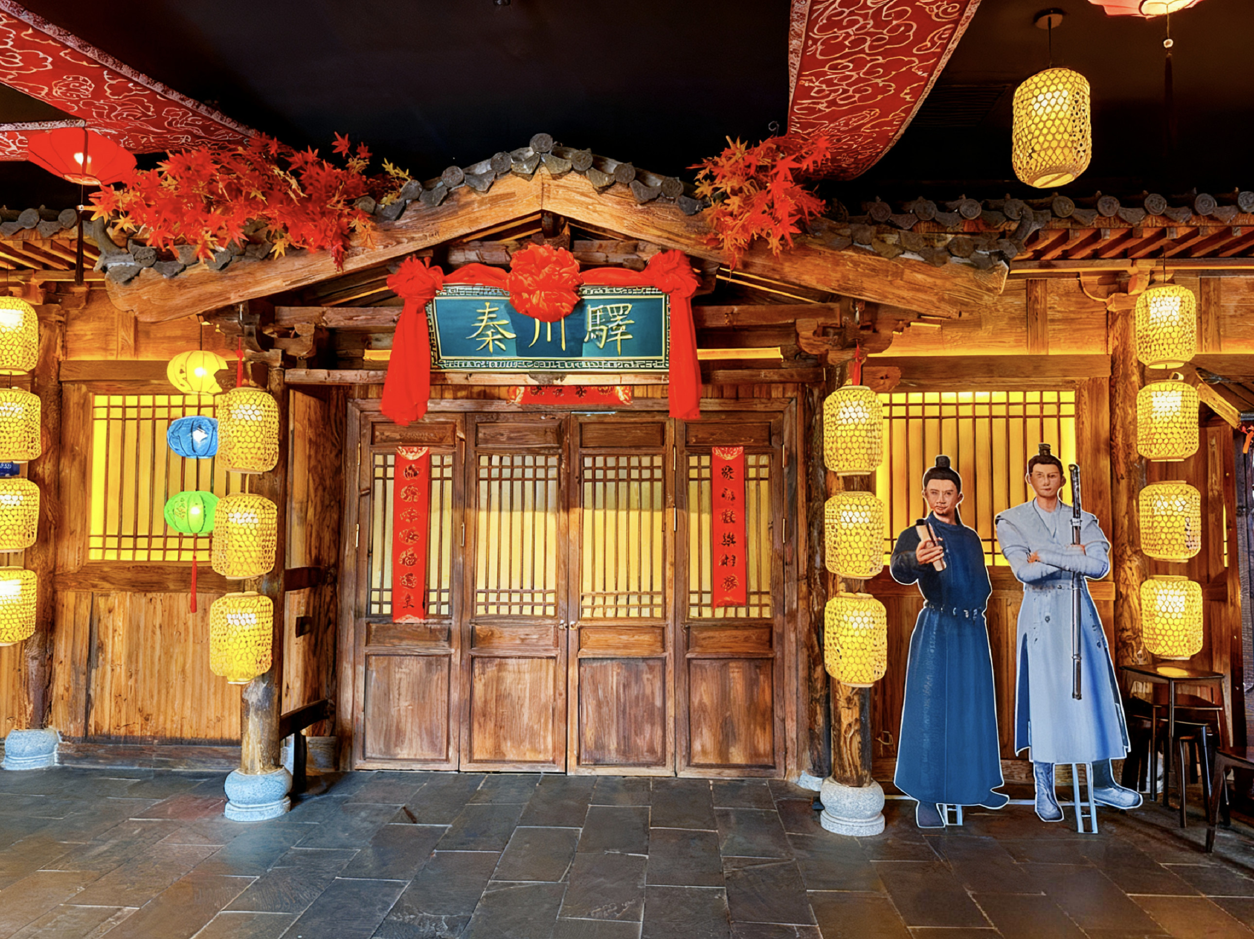 - 步入劇場,硃紅宮牆下鎏金燈籠光影搖曳,西域商肆的貨架上琉璃器皿折射出異域光澤,敦煌壁畫風格的紋飾在牆面流轉,胡樂聲與市井吆喝聲交織耳畔,濃郁的盛唐菸火氣瞬間將人包裹