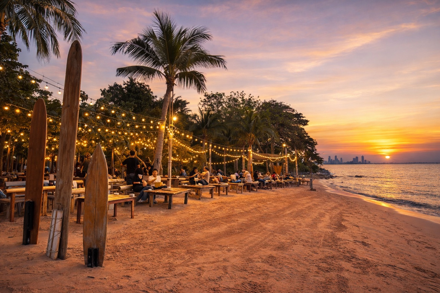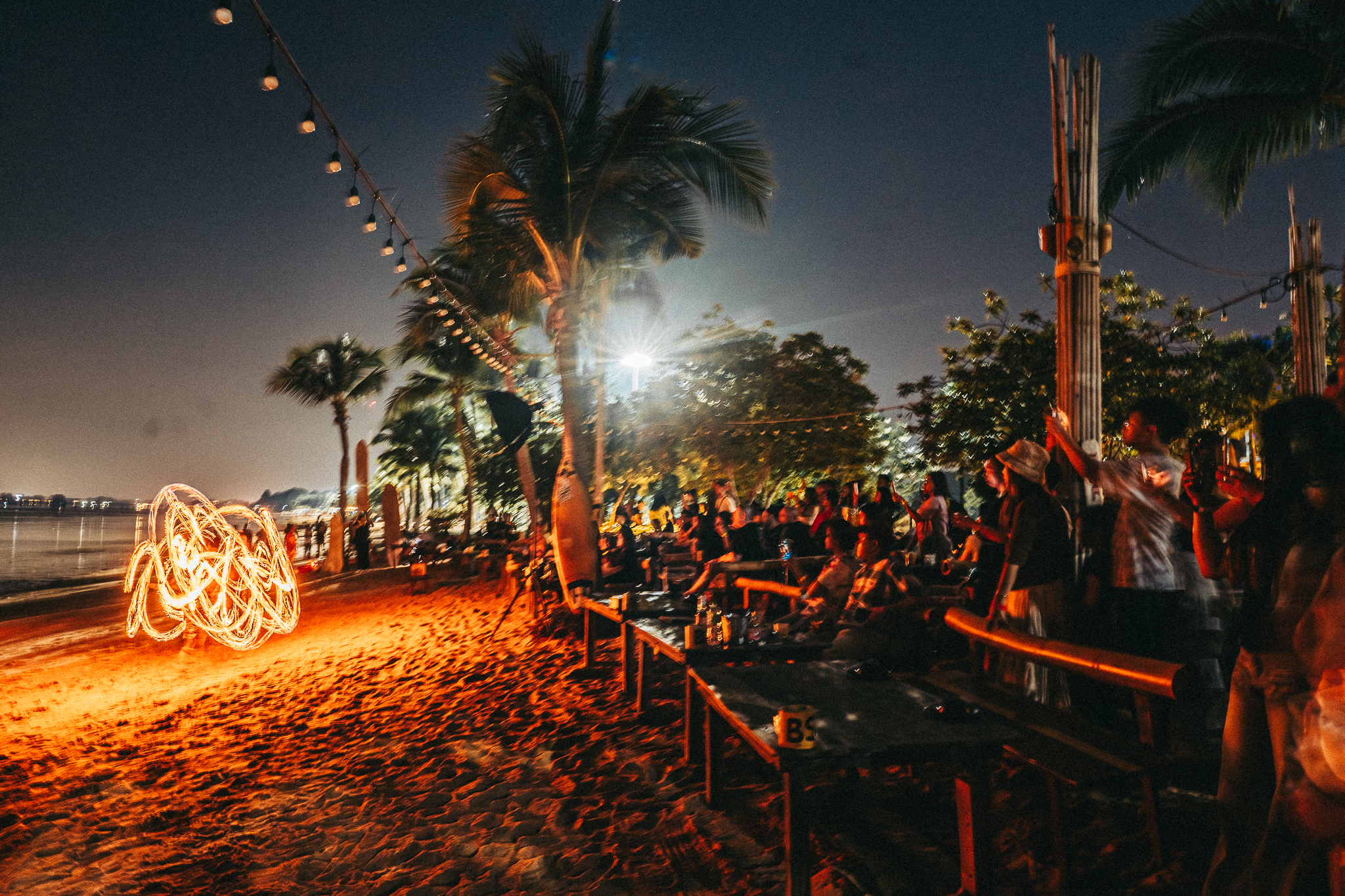 前往芭達雅 DAM PATTAYA,在完全環保舒適的環境中,欣賞芭達雅最具代表性的海灘火焰秀。您可以選擇前排海濱泰式巨型竹製座位,欣賞泰國最高的「火焰噴泉」之一。您可以選擇兩種座位:情侶巨型竹製座位,以及由芭達雅當地木匠以泰國著名巨型竹子打造的 4-6 人巨型竹製沙發。欣賞真理寺的壯麗景色,以及世界級林查班國際海港的夜間燈光。我們的火焰表演者都經過專業訓練,在 DAM Pattaya 獨家呈現獨一無二的腎上腺素飆升表演!我們也提供數位夜景火焰攝影服務。在欣賞表演的同時,還能享用著名的泰國當地和國際美食,以及各式各樣的豐盛飲品。