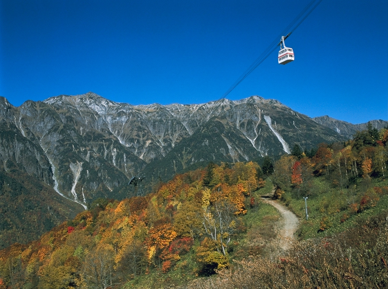 在新穗高搭乘日本唯一一座雙層纜車,乘坐纜車上升到2156m高的山頂,從高空鳥瞰山嶽,欣賞日本北阿爾卑斯群山無與倫比的四季山景。