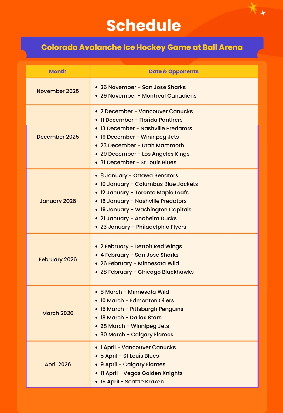 - 多種比賽日期任您選擇,親眼見證雪崩隊與頂尖 NHL 球隊的精彩對決。