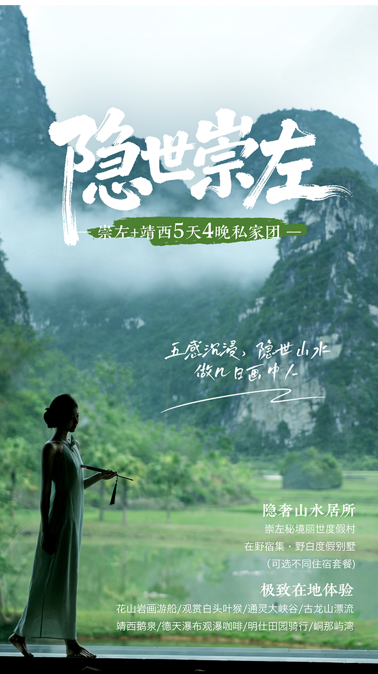 - 入畫崇左,墨色山影在窗外初染。尋跡的大地印記,是巖壁上的史詩或葉猴躍動的一筆。而後深入秘境,探幽於青綠交疊的峽谷與泉源之間。及至覽勝,便是在瀑布的飛白與田園的淡彩間,飽覽山水合卷的磅礴與閒逸。而真正的旅程落點,在於歸心——宿於野奢畫境,讓身心棲於這幅天地的精魂裡,完成從行遊到棲居的詩意閉環。